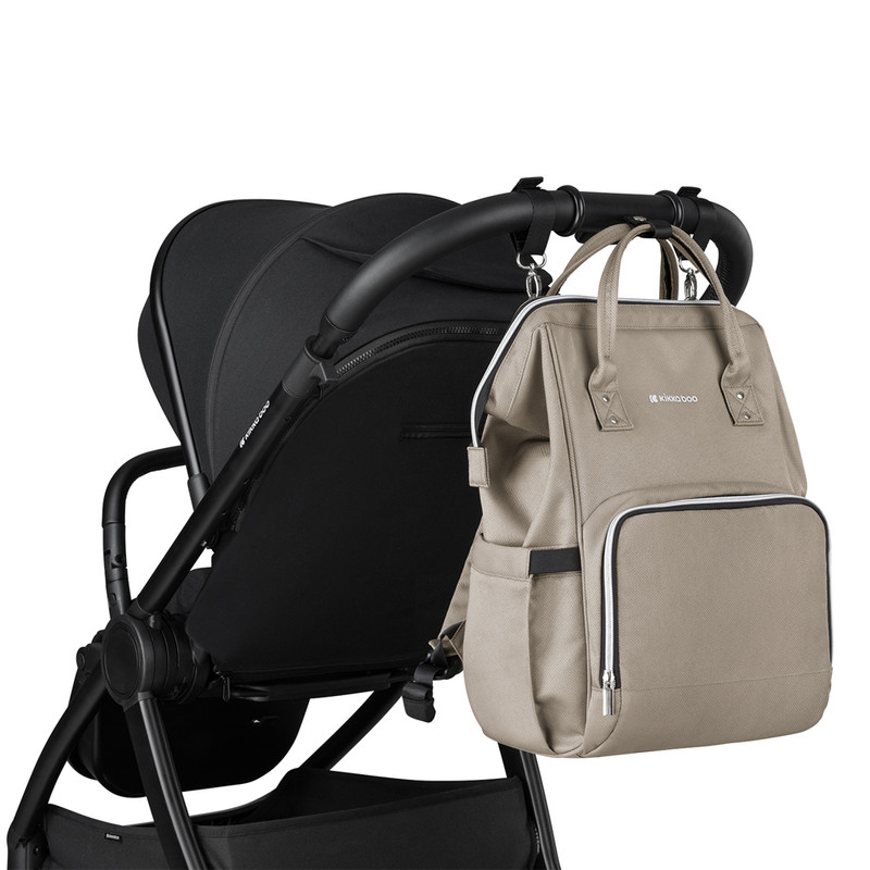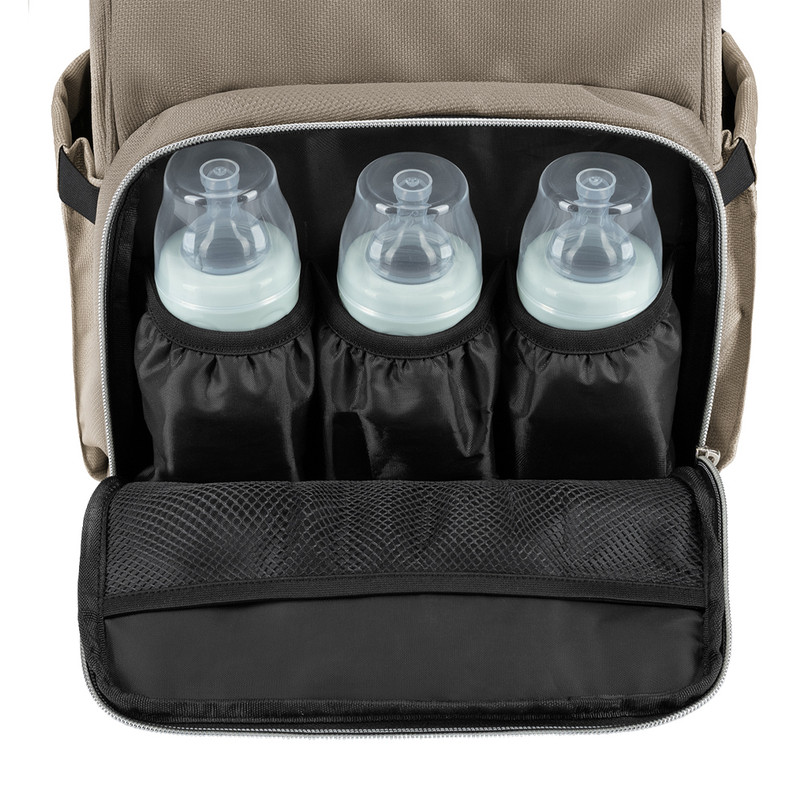 تهیه شده از پارچه ی ملانژ لوکس جنس 100 درصد پلی استر دهانه ی عریض جیب های کوچک مخصوص وسایل دارای بخش مجهز به عایق دارای زیرانداز تعویض دارای بند اتصال به کالسکه سایز 40*27*14 سانتی متر وزن 800 گرم