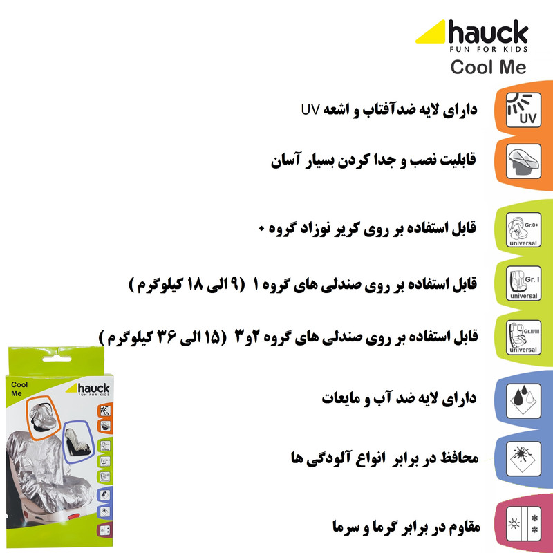 صندلی خودرو کودک دیگر به عنوان یکی از ملزومات مهم برای خانواده هایی که دارای فرزند نوزاد خردسال هستند در آمده است. این صندلی با توجه به اهمیتی که در حمل و نقل و ایجاد راحتی برای نوزاد دارد می بایست به خوبی نگهداری شود .از طرفی قیمت نسبتا بالای انواع صندلی خودرو کودک نیز کوشش برای نگهداری بهتر از آن را لازم می کند. یکی از آسیبهایی که برای صندلی های خودرو کودک وجود دارد،قرار گرفتن آن در معرض تابش مستقیم نورآفتاب است. برای جلوگیری از این اتفاق شرکت هاوک محصولی پیشنهاد داده است. کاور صندلی خودروی کودک هاوک مدل Cool Me hauck 61834 مخصوص استفاده برای محافظت از صندلی کودک می باشد. این محصول که دارای لایه ضد اشعه آفتاب میباشد با کاور کردن صندلی کودک در مقابل تابش آفتاب باعث جلوگیری از بورشدن و پارگی روکش پارچه ای وقسمت های پلاستیکی صندلی کودک و آسیب به صندلی کودک شده و در نهایت باعث دوام بیشتر میشود وهمچنین با جلوگیری کردن از ورود و نشستن گرد و خاک بر روی صندلی مانع از ایجاد حساسیت و آلرژی برای کودک میگردد