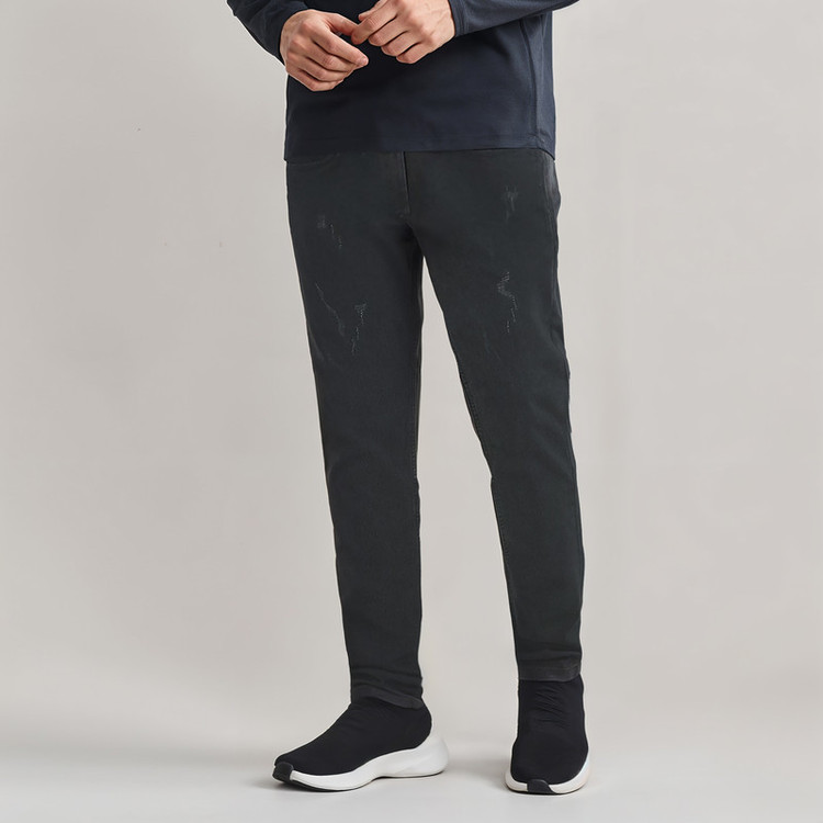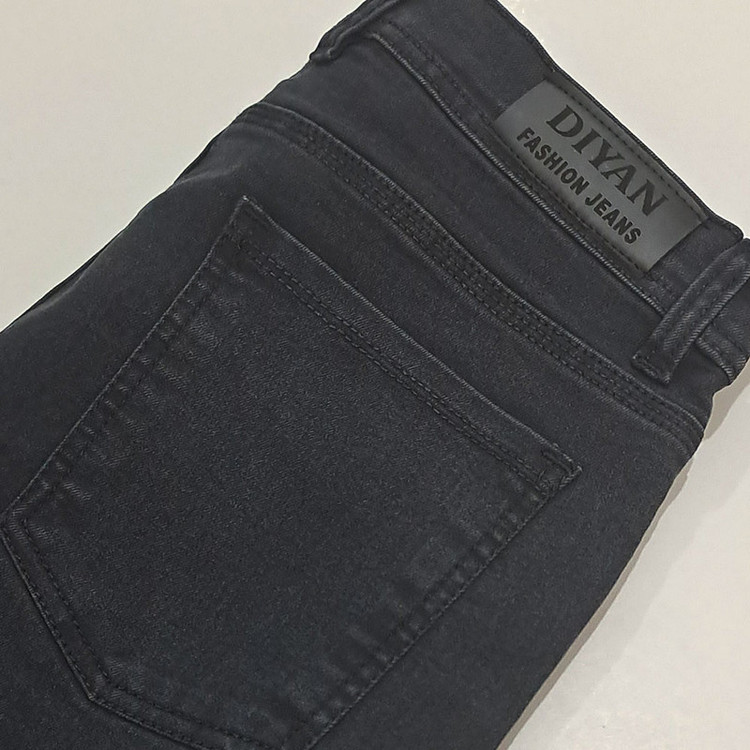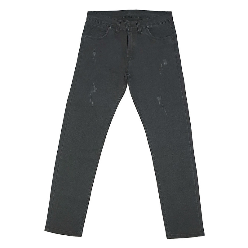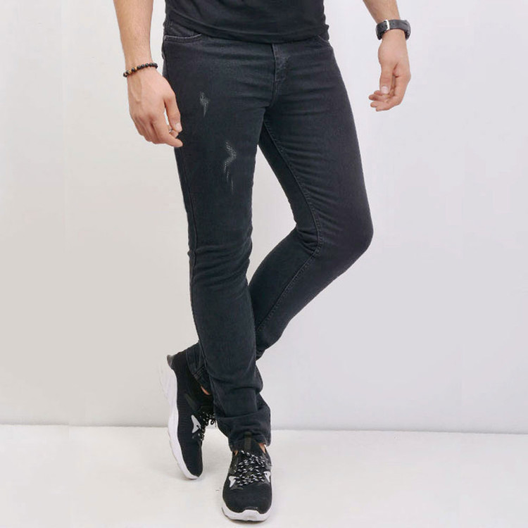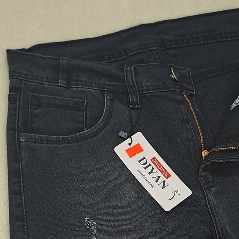 (پارچه ی جین نیم کش) (رنگ = زغالی) (زاپ دار سطحی ( زخمی ) ) (دارای چهار جیب) (فرم اسلیم) (بسته شدن فاق به وسیله ی زیپ)
