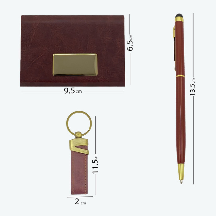 اقلام همراه این ست شامل:جا کارتی مگنتی،خودکار کمر پیچ تاچ دار و جا کلیدی میباشد.