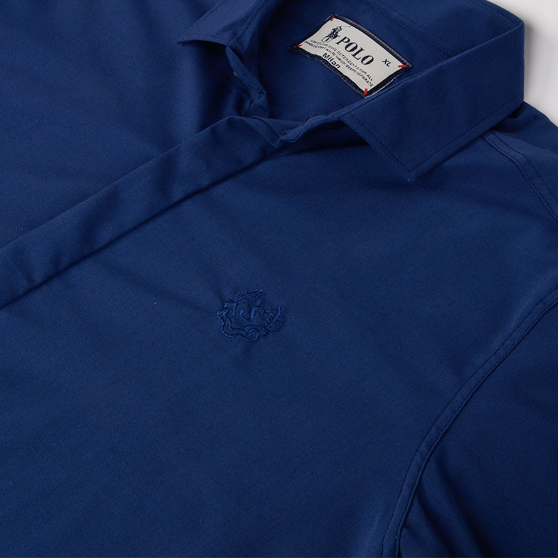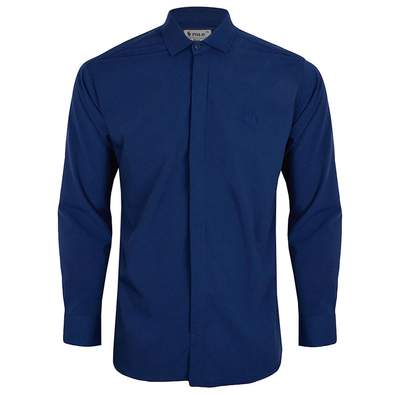 پیراهن مردانه جنس نخی ویسکوز آستین بلند لوگوی گلدوزی شده قد لباس تا روی باسن تن خور اسلیم پیراهن دکمه مخفی طرح پارچه ساده