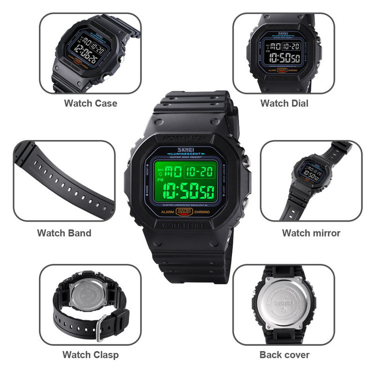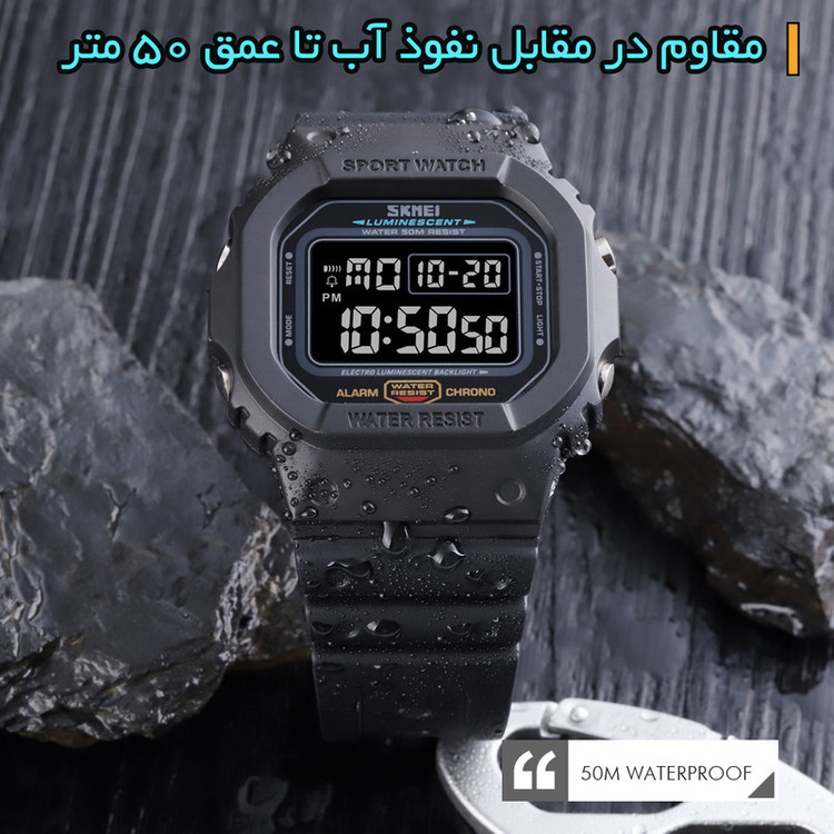نمایش 24 ساعته , نمایش ساعت دوم , آلارم , نور پسزمینه , تاریخشمار , ضدآب