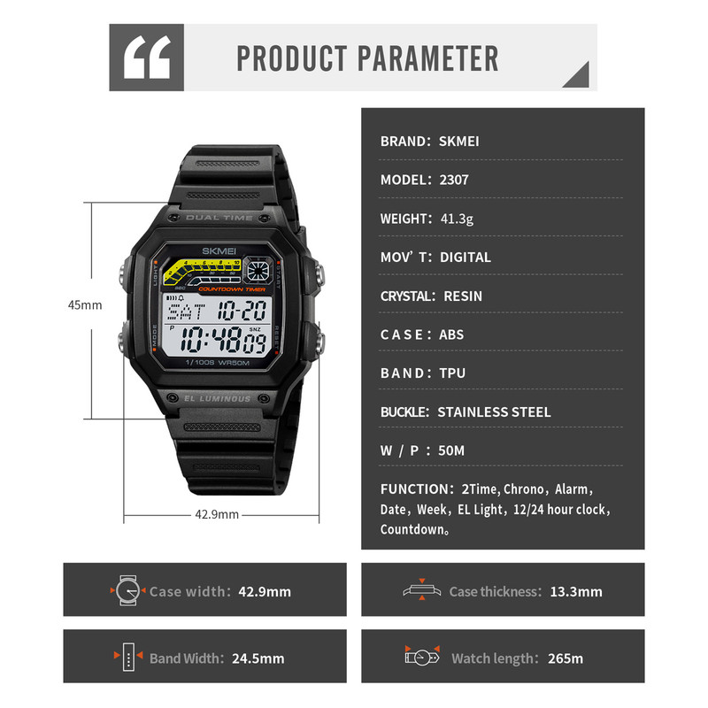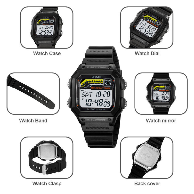 نمایش 24 ساعته , نمایش ساعت دوم , نور پسزمینه , تاریخشمار , آلارم , ضدآب