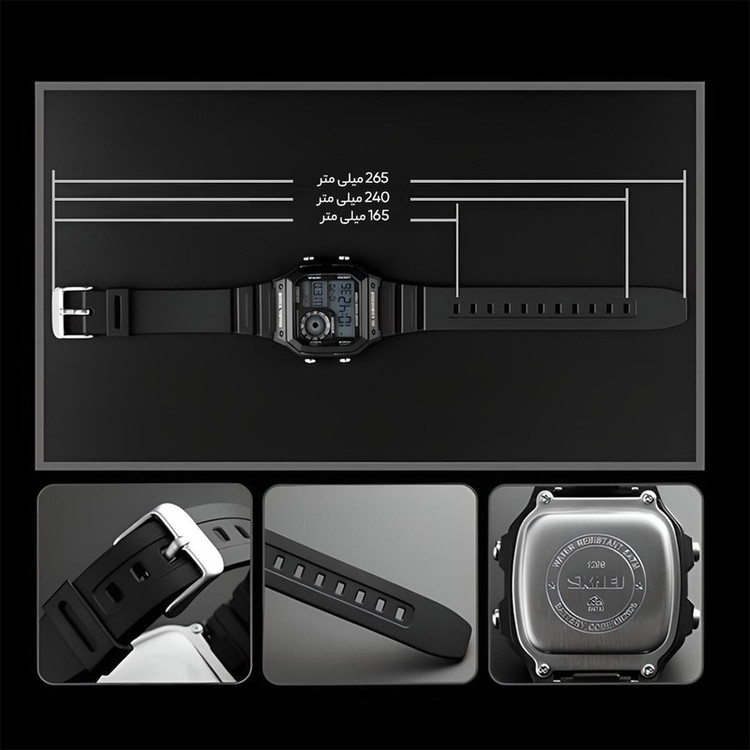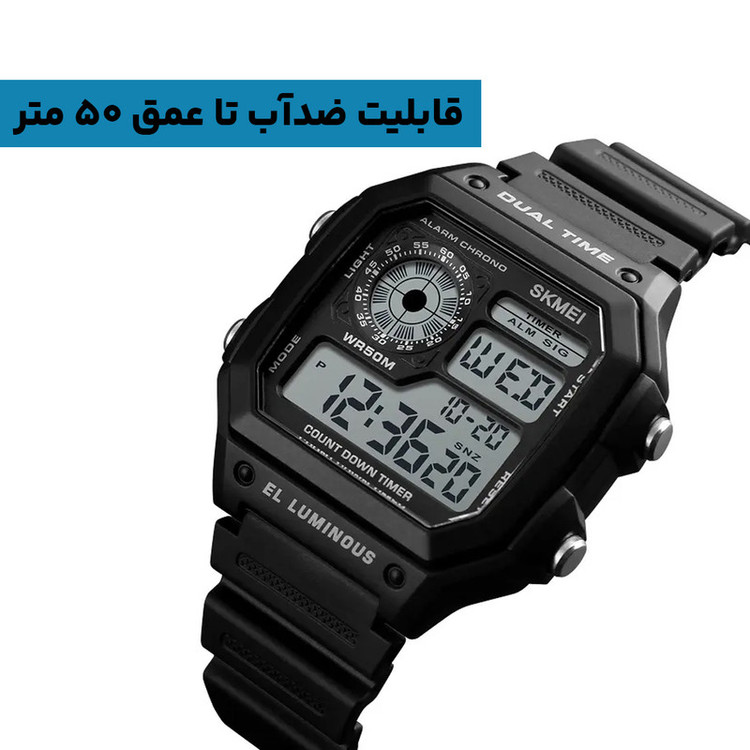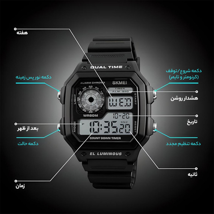 نمایش 24 ساعته , نمایش ساعت دوم , تاریخشمار , نور پسزمینه , تایمر , آلارم , شیشه ضدخش , کرنوگراف