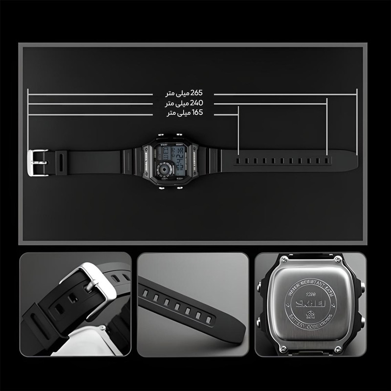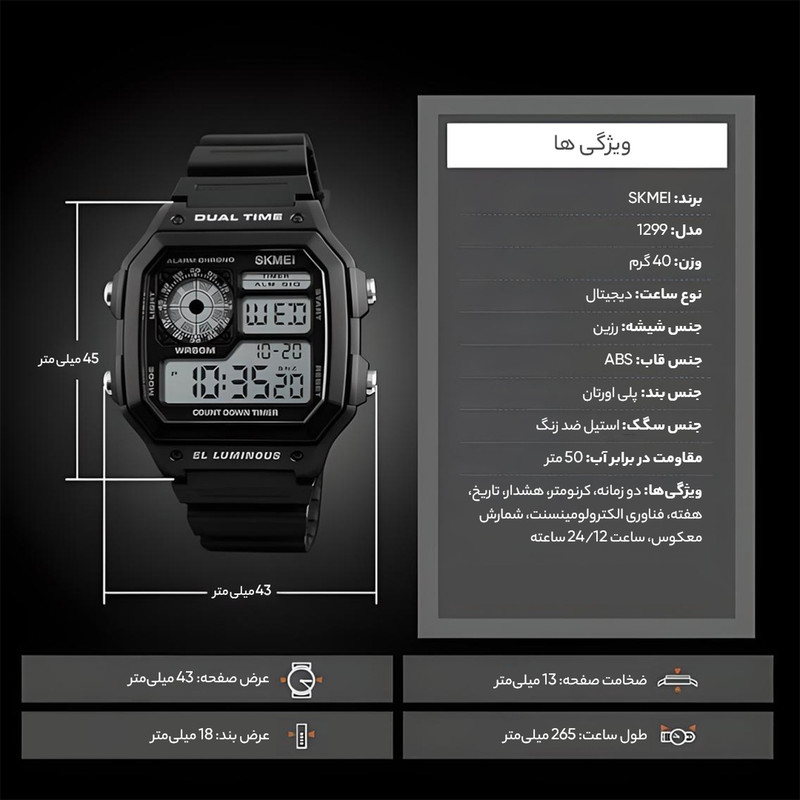 نمایش 24 ساعته , نمایش ساعت دوم , تاریخشمار , نور پسزمینه , تایمر , آلارم , شیشه ضدخش , کرنوگراف