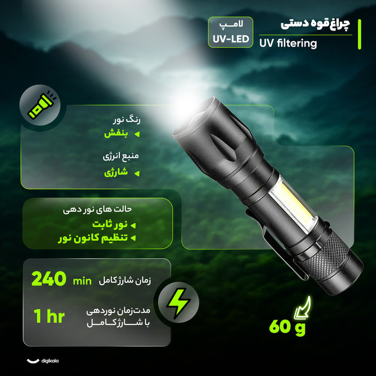 چراغقوه دستی UV Filtering دوکاره یک ابزار حرفهای و کاربردی است که ترکیبی از نور فرابنفش و نور سفید را ارائه میدهد و برای استفاده روزمره و فعالیتهای تخصصی مناسب است. این چراغقوه شارژی با بدنه فلزی مقاوم و وزن سبک ۶۰ گرم، حمل و نگهداری آسانی دارد و ابعاد جمعوجور ۷۰x۳۰x۳۰ میلیمتر، امکان قراردادن آن در کیف یا جیب را فراهم میکند. لامپ UV این چراغ قوه با نور بنفش امکان تشخیص سنگهای قیمتی، بررسی رنگ خودرو، خشککردن چسبها، پیداکردن محل ادرار حیوانات و تشخیص اسکناس و چکهای تقلبی را فراهم میکند، درحالیکه نور سفید تعبیهشده کنار چراغ، برای روشنایی عمومی و دید بهتر در محیطهای تاریک کاربرد دارد. نور چراغ ثابت بوده و قابلیت تنظیم کانون نور، تمرکز تابش را متناسب با نیاز کاربر فراهم میکند. این چراغقوه دارای باتری شارژی داخلی است که پس از ۲۴۰ دقیقه شارژ کامل، حدود یک ساعت نوردهی مداوم ارائه میدهد. مقاومت بدنه در برابر آب و همراه بودن بند حمل، استفاده از محصول را در شرایط مختلف آسان و مطمئن میکند. باتوجهبه ترکیب نور فرابنفش و سفید، بدنه مقاوم، قابلیت شارژ و وزن سبک، چراغقوه UV Filtering دوکاره انتخابی ایدهآل برای علاقهمندان به کارهای تخصصی، تشخیص مواد و کاربردهای روزمره است و تجربهای حرفهای، دقیق و قابل اعتماد از روشنایی فراهم میآورد.