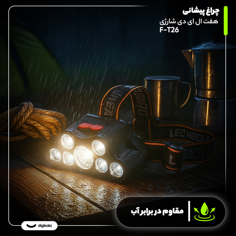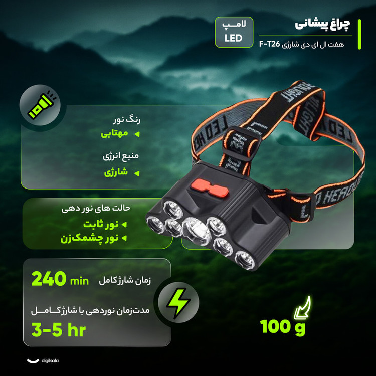 چراغ پیشانی مدل F-T26 با طراحی سبک و مقاوم، یک انتخاب عالی برای کمپینگ، شکار و استفاده روزمره است. این چراغ با ۷ لامپ LED پرقدرت و نور مهتابی، روشنایی وسیع با برد تا ۵۰ متر فراهم میکند و دارای دو حالت نوردهی ثابت و چشمکزن است. باتری لیتیومی داخلی آن پس از ۲۴۰ دقیقه شارژ کامل، بین ۳ تا ۴ ساعت نوردهی مداوم ارائه میدهد و از طریق درگاه شارژی بهراحتی شارژ میشود. بدنه پلاستیک فشرده و مقاومت در برابر آب، استفاده از چراغ را در شرایط آبوهوایی مختلف ایمن میسازد. بند پیشانی قابلتنظیم راحتی استفاده طولانیمدت را تضمین کرده و دستان شما را در حین کار یا فعالیتهای بیرونی آزاد میگذارد. چراغ پیشانی F-T26 ترکیبی از قدرت نوردهی، دوام و طراحی کاربردی است و همراهی مطمئن در ماجراجوییها و شرایط روزمره به شمار میآید.