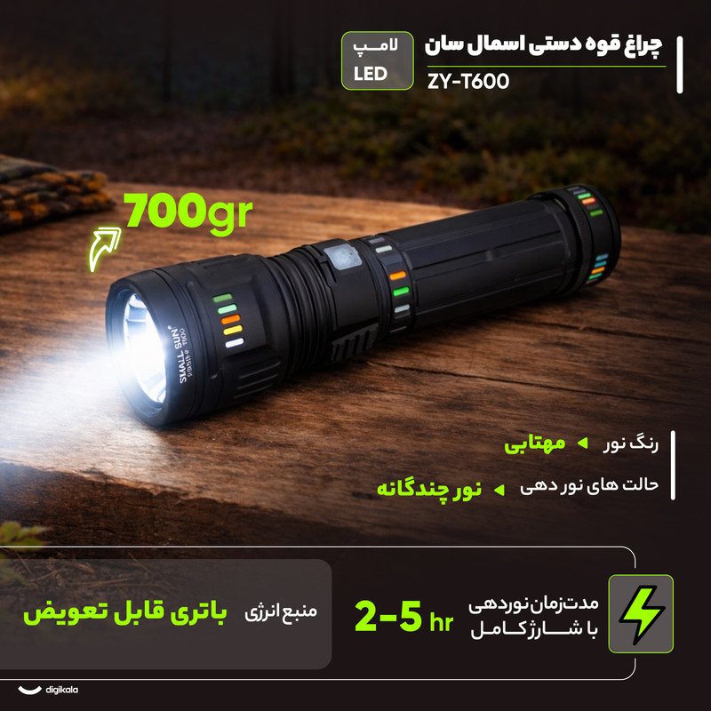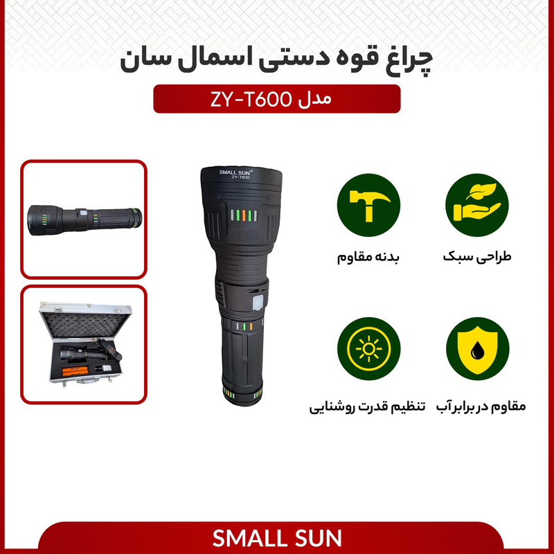 اگر به دنبال یک چراغ قوه باکیفیت و عملکرد عالی هستید، چراغ قوه پلیسی زومدار اسمال سان ZY-T600 گزینهای ایدهآل است. این چراغ قوه با روشنایی ۵۰۰۰ لومن و برد نور ۱۰۰۰ متر، استفاده در شرایط مختلف را ممکن میکند. با دو حالت نوردهی خطی و پخش نور و قابلیت زوم، همه چیز در تاریکی بهوضوح قابل مشاهده است. همچنین با ۴ عدد باتری ۴۸۰۰ میلیآمپر و قابلیت استفاده بهعنوان پاور بانک، عمر باتری طولانی و کارایی بالا را تجربه خواهید کرد. بدنه چراغ قوه دارای مقاومت در برابر آب، ضربه و خراش است و آن را برای محیطهای سخت مناسب میکند.