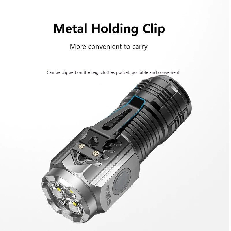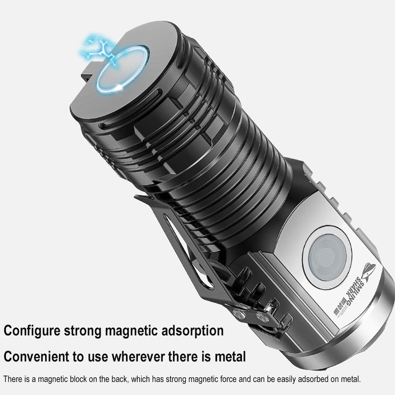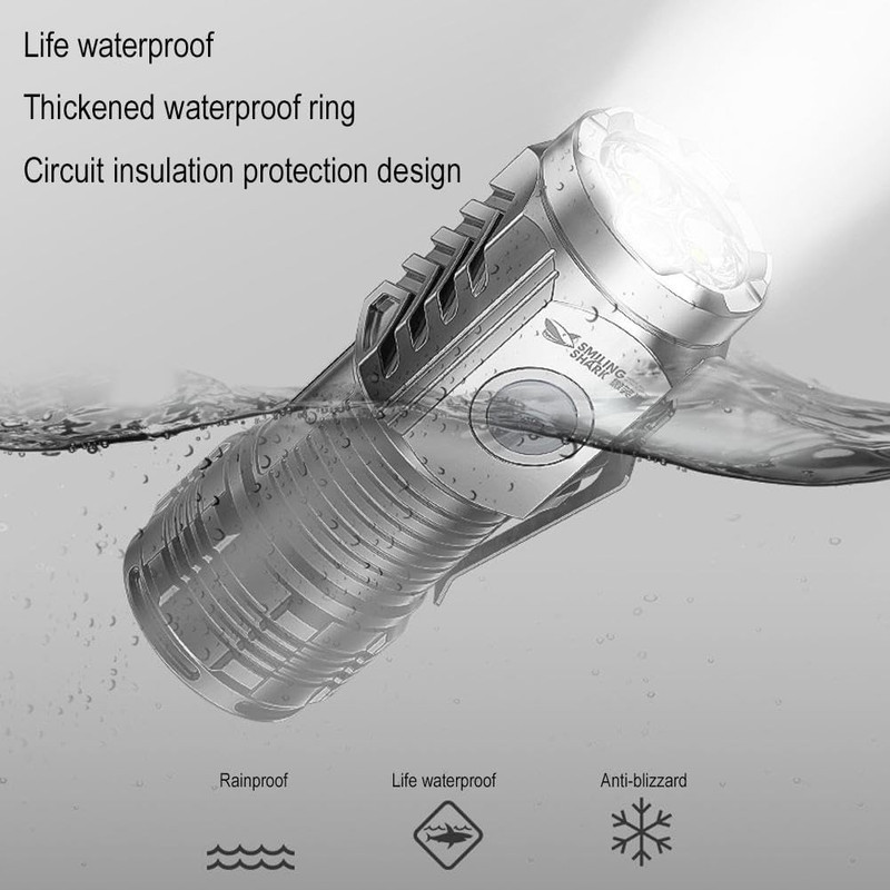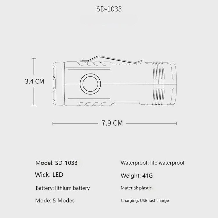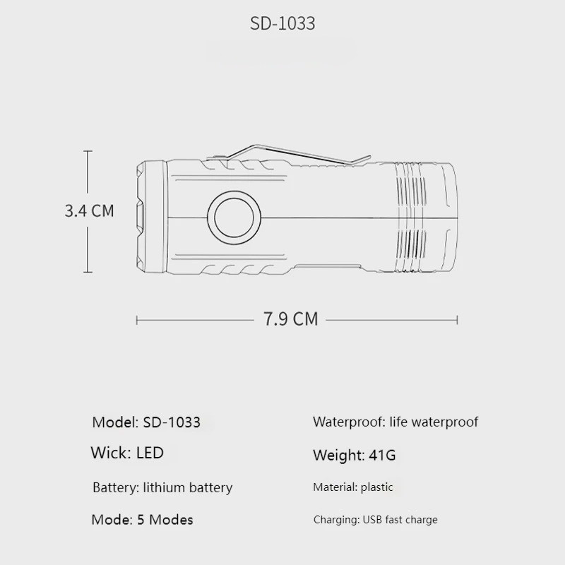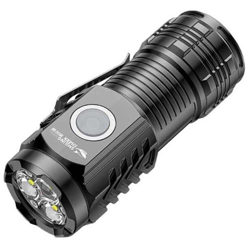 چراغ قوه شارژی اسمایلینگ شارک مدل SD-1033 مجهز به سه مهره لامپ با روشنایی بالا است که می تواند نور را محکم تر متمرکز کند و عملکرد دوربرد قوی تری ارائه دهد. این چراغ قوه دارای طراحی یکپارچه ضد آب است، بنابراین بدون هیچ مشکلی در برابر باد و باران مقاومت می کند. دارای یک حلقه لاستیکی ضد آب با چگالی بالا، بدنه کاملاً مهر و موم شده و مقاوم در برابر آب است و از مدار داخلی محافظت می کند. حتی در روزهای بارانی نیز می تواند روشنایی منظمی داشته باشد. این چراغ قوه کوچک دارای طراحی منحصر به فرد گیره فولادی ضد زنگ است که به طور ایمن نگه داشته می شود و به راحتی نمی افتد. گیره فولادی ضد زنگ را می توان در هر مکانی وصل کرد، بدون محدودیت در محیط روشنایی. بدنه جمع و جور و سبک آن باعث می شود که به راحتی در یک جیب یا کیف برای استفاده راحت در حین حرکت جا شود.