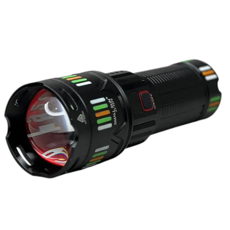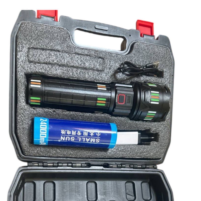 چراغ قوه زومدار اسمال سان مدل T-292 با برد نور 1200 متر می باشد و دارای 4 حالت نوردهی می باشد . و با قدرت روشنایی 5000 لومن می باشد . و با قابلیت زوم که واضح 1200 متر رو میزند و در حالت پخش نوری 500 متر را کاملا روشن می کند . و دارای صفحه نمایشگر شارژ میباشد که دقیقا نشان می دهد درصد شارژ چراغ قوه چقدر باقی مانده و وقتی که درصد شارژ چراغ قوه به 20 درصد آمد حتما باید به شارژ بزنید و تا 100 درصد کاملا شارژ بشود. و این چراغ قوه دارای باتری 24000 میلی آمپری می باشد. و حتی اگر کم ازش استفاده کنید باید هر ماه حداقل 1 بار به شارژ بزنید چون برای سلامتی باتری و خود چراغ قوه خیلی خوب می باشد . برای اینکه این چراغ قوه زیباتر رونمایی بشود و طرافدار های بیشتر و جذب کند تو کارخانه برای این چراغ قوه از یک جعبه حمل فوقالعاده محکم استفاده کرده اند و حتی جعبه خود چراغ قوه خیلی جذاب و خیلی هم محکم می باشد.