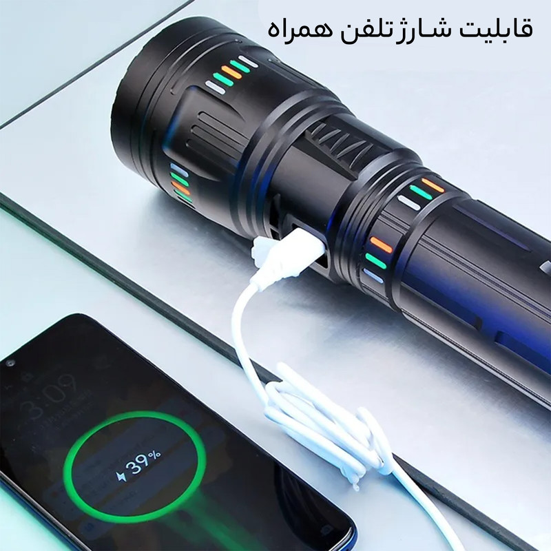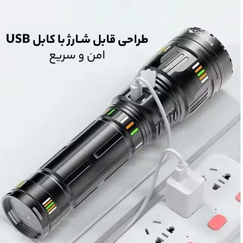 برد نور و قدرت روشنایی با برد تا 1000 متر و 5000 لومن، این چراغ قوه به شما در شرایط تاریکی کمک میکند و محیط اطراف را به درستی بررسی کنید.