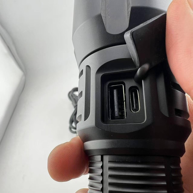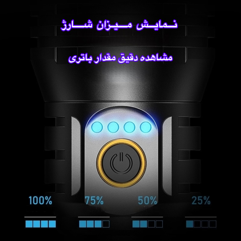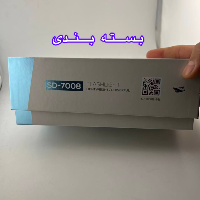 چراغ قوه SD-7008 مجهز به باتری لیتیوم یونی داخلی قابل شارژ است که از طریق پورت ۵ ولت / ۱.۵ آمپر شارژ میشود. نشانگرهای LED روی بدنه، میزان شارژ باتری را بهصورت مرحلهای نمایش میدهند تا کاربر از وضعیت آن آگاه باشد.