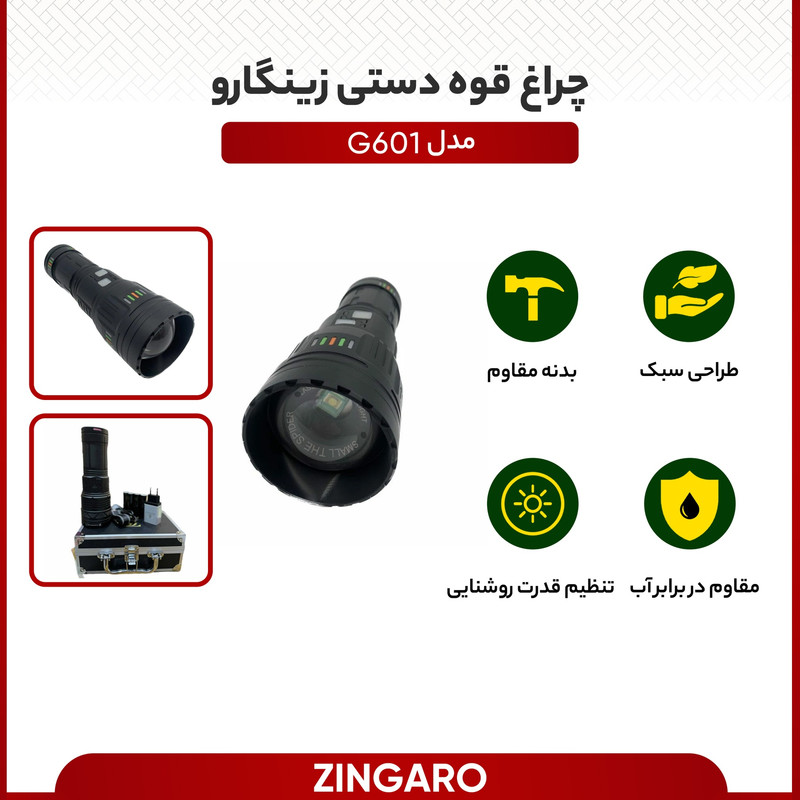 چراغ قوه زینگارو G601، یک مدل برجسته از این برند معتبر است که برای فعالیتهایی مانند طبیعتگردی، پیکنیک، کوهنوردی و کمپینگ بسیار مناسب است. این چراغ قوه با قابلیت زوم، روشنایی 5000 لومن و برد نوری تا 1000 متر، اطمینان میدهد که شما در شرایط تاریکی به راحتی مسیر خود را پیدا کنید. مدت زمان نوردهی آن بین 3 تا 7 ساعت متغیر است و به حالت نوری انتخابی شما بستگی دارد. این چراغ قوه با رنگ نور سفید و مهتاب، و دارای بدنهای از آلومنیوم مقاوم و ضد آب است. با باتری قوی با ظرفیت 10000 میلی آمپر، این چراغ قوه همچنین به عنوان یک پاور بانک عمل میکند و دارای نمایشگر شارژ باتری میباشد.