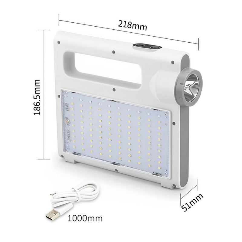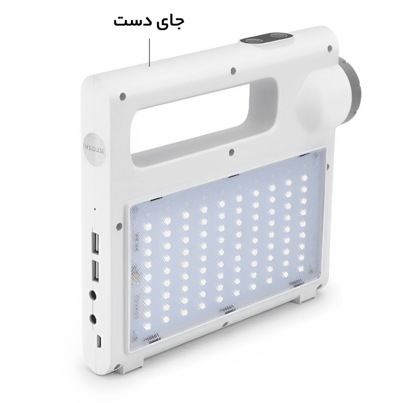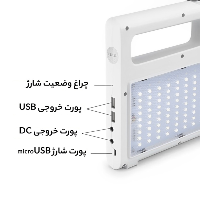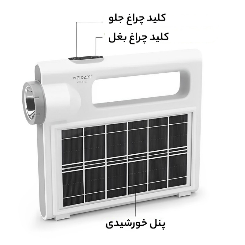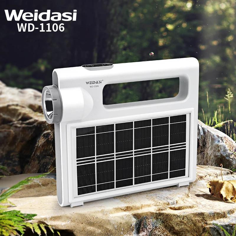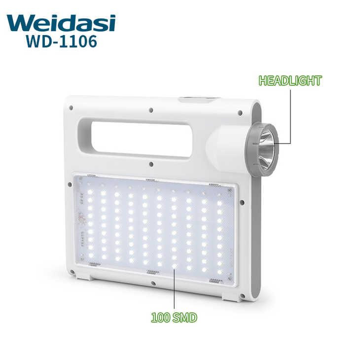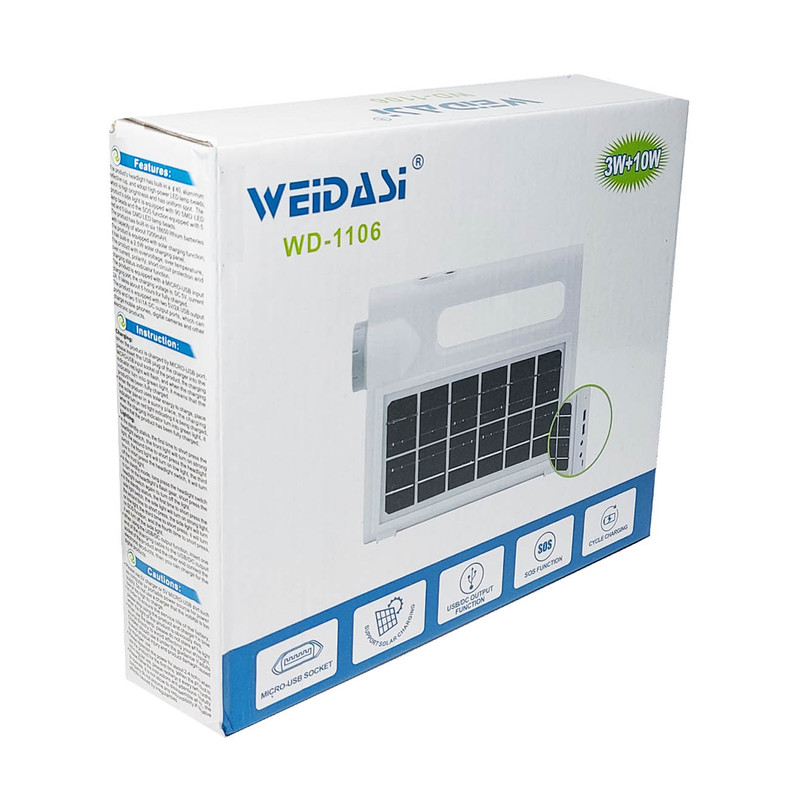 چراغ اضطراری و چراغ قوه خورشیدی ویداسی مدل WD-1106 علاوه بر تامین انرژی الکتریکی مورد نیاز خود از طریق پنل 2.5 واتی خورشیدی نصب شده بر روی وجه جانبی خود ، از طریق برق شهر و با شارژر موبایل نیز شارژ می شود تا 6 عدد باتری لیتیوم یون داخلی به ظرفیت کل 7200 میلی آمپر ساعت را جهت بهره برداری برای روشنایی و پاور بانک آماده کند . این چراغ قوه 2 خروجی USB برای شارژ موبایل و دستگاههای همردیف دارد و همچنین دو جک یا خروجی فیش آداپتوری 5 میلی متری نیز در قسمت پشت دستگاه و در زیر خروجی USB قرار گرفته است . در قسمت جانبی دستگاه تعداد 90 عدد ال ای دی SMD برای تامین روشنایی نصب شده است که با توان 10 وات راه اندازی می شود . و همچنین یک لامپ پرنور با توان 3 وات در قسمت مقابل آن بعنوان چراغ قوه قرار دارد . نور آبی و قرمز چشمک زن در قسمت فوقانی ال ای دی با نور سفید ، برای اخطار ، نصب شده است که فشردن متوالی بر روی دکمه بالای دستگاه روشن می شود .