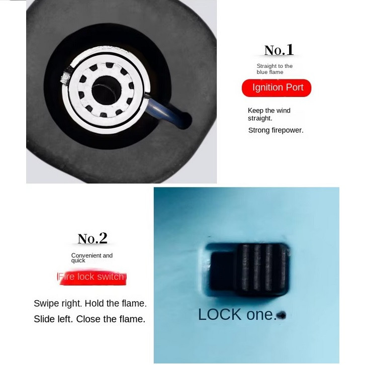 ویژگیهای شعلهافکن: پیچ کنترل حجم شعله , قفل ایمنی , فندک سر خود