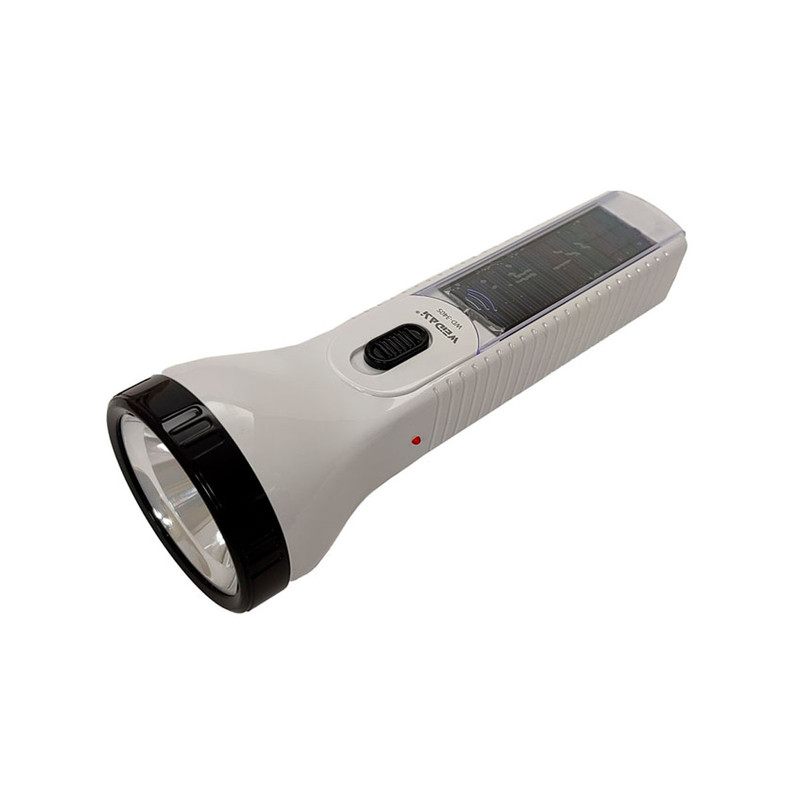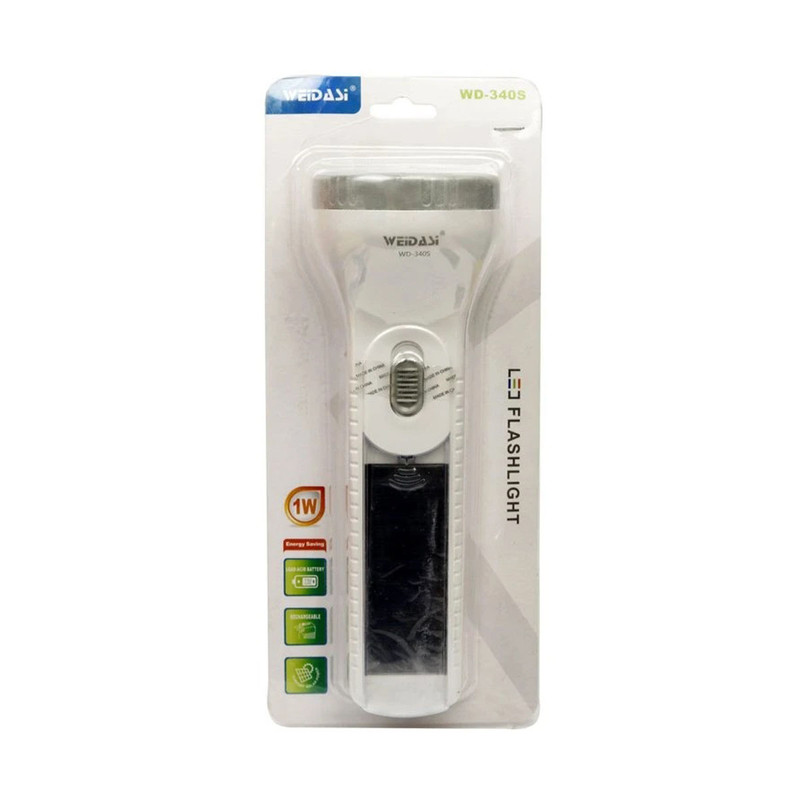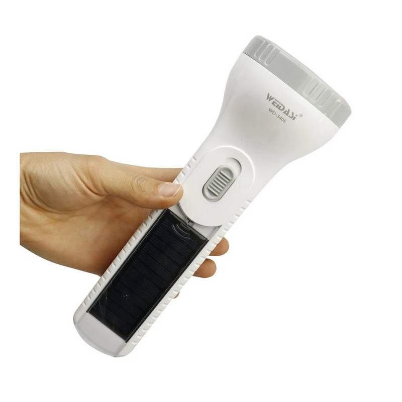 چراغ قوه مدل WD-340S ساخت برند WEIDASI یک محصول کاربردی جهت استفاده در کمپینگ، کوهنوردی، مسافرت، طبیعت گردی و... است. در داخل محفظه چراغ قوه یک عدد لامپ LED تعبیه شده که نور ساطع شده از آن مهتابی بوده و میزان روشنایی به ۵۰ لومن می رسد، همچنین قابلیت تنظیم حالت نوردهی به صورت پر نور و کم نور داشته و توان خروجی کلی آن معادل ۱ وات است. چراغ قوه مجهز به یک باتری داخلی با ظرفیت ۷۵۰ میلی آمپر ساعت می باشد که مدت زمان شارژدهی آن حدود ۳ ساعت به صورت نور قوی و ۷ ساعت در حالت نور متعادل خواهد بود. محصول بدنه ای از جنس پلاستیک مقاوم و سبک داشته و بر روی آن یک نشانگر LED جهت نمایش وضعیت شارژ قرار داده شده است، پس از اتمام شارژ باتری، قابلیت شارژ مجدد آن به وسیله دو شاخه داخلی تعبیه شده روی محصول با اتصال به برق شهری در طی ۹ ساعت وجود دارد. علاوه بر این، از دیگر ویژگی های چراغ قوه WD-340S مجهز بودن به پنل خورشیدی جهت تامین انرژی دستگاه است.چراغ قوه کد wd-340s ویداسی دستی و با قابلیت تنظیم نور مهتابی است. چراغ قوه ویداسی 340s دارای صفحه خورشیدی و باتری داخلی 750 میلی آمپر ساعتی است که از این دو طریق شارژ میگردد و نور آن تا 50 لومن است. مدت زمان شارژ شدن این چراغ قوه 8 ساعت است. فراموش نکنید که چراغ قوه ها در زمان شارژ بهتر است روشن نشوند. چراغ قوه دستی ویداسی بسیار کم مصرف و توان خروجی یک وات دارد. این چراغ قوه قابل حمل و برای کوهنوردی، طبیعت گردی، به کار برده میشود. همچنین ویداسی wd-340s ضدآب نیز میباشد. لازم به ذکر است که نشانگر led روی بدنۀ چراغ قوه، جهت نمایش وضعیت شارژ است.