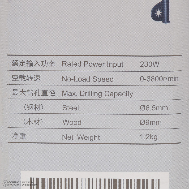این دریل به سهنظام ۶.۵ میلیمتری آچاری مجهز است که استحکام کافی برای نگهداری مته را فراهم میکند. موتور آن با توان مصرفی ۲۳۰ وات، سرعتی برابر با ۳۸۰۰ دور در دقیقه تولید میکند که برای سوراخکاری دقیق در سطوح مختلف مناسب است. حداکثر قطر سوراخکاری در فلز ۶.۵ میلیمتر و در چوب ۹ میلیمتر در نظر گرفته شده که آن را به ابزاری کاربردی برای پروژههای سبک و روزمره تبدیل میسازد.