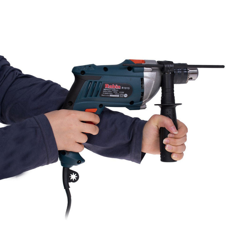دریل ضربه ای یا همان دریل چکشی مدل R1015 توسط شرکت رابین به بازار عرضه شده است. موتور دریل نیم تنه فلزی رابین، یک موتور 810 وات با ولتاژ ورودی 220 ولت تا حداکثر ولتاژ 240 ولت است. موتور قدرتمند این دستگاه قادر است سرعت گردش آزاد را تا 2800 دور بر دقیقه ایجاد کند که به وسیلهی کلید گازی دیمردار ضد غبار مطابق با استاندارد TUV قابل تنظیم و کنترل است.از جمله قابلیتها و مزیتهای دریل چکشی رابین میتوان به سیستم گردش راستگرد و چپگرد آن اشاره کرد.این دریل دارای سری سه نظام 13 میلیمتری از جنس فلز است که توان و قدرت بالایی را در هنگام سوراخکاری به همراه دارد.این دستگاه مجهز به سوئیچ قفلکن کلید است.