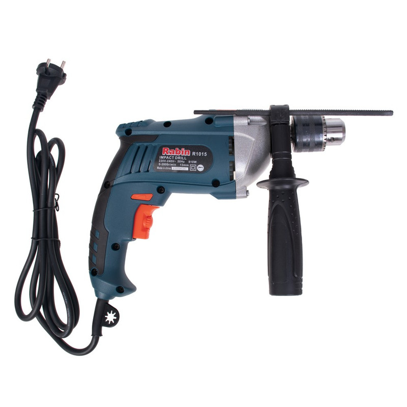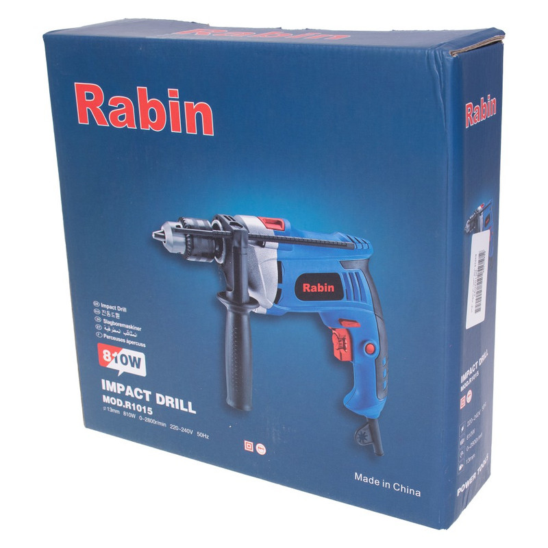 دریل ضربه ای یا همان دریل چکشی مدل R1015 توسط شرکت رابین به بازار عرضه شده است. موتور دریل نیم تنه فلزی رابین، یک موتور 810 وات با ولتاژ ورودی 220 ولت تا حداکثر ولتاژ 240 ولت است. موتور قدرتمند این دستگاه قادر است سرعت گردش آزاد را تا 2800 دور بر دقیقه ایجاد کند که به وسیلهی کلید گازی دیمردار ضد غبار مطابق با استاندارد TUV قابل تنظیم و کنترل است.از جمله قابلیتها و مزیتهای دریل چکشی رابین میتوان به سیستم گردش راستگرد و چپگرد آن اشاره کرد.این دریل دارای سری سه نظام 13 میلیمتری از جنس فلز است که توان و قدرت بالایی را در هنگام سوراخکاری به همراه دارد.این دستگاه مجهز به سوئیچ قفلکن کلید است.