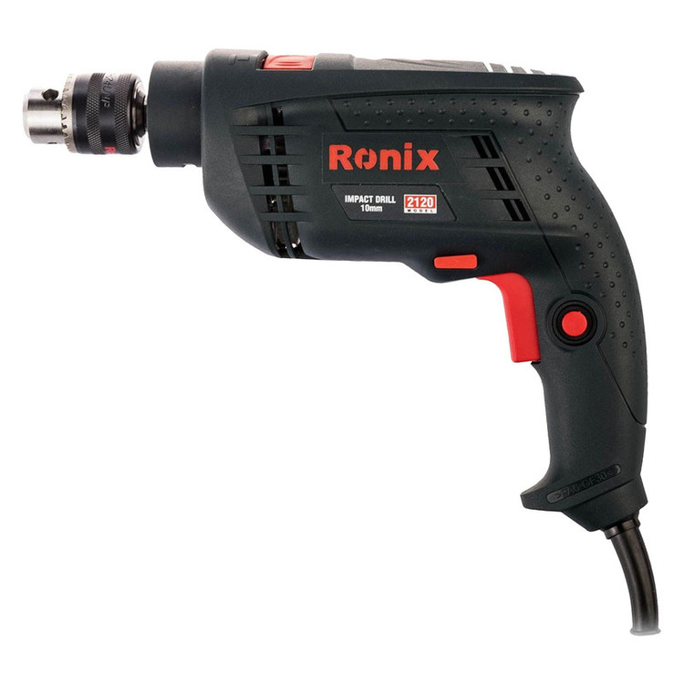 دریل ابزاری شناخته شده در صنعت است که برای سوراخکاری سطوح مختلف به کار گرفته میشود. محصول فوق دریل چکشی (Ronix) «رونیکس» با عنوان مدل (2120) است. این ابزار مناسب برای سوراخکاری معمولی و سوراخکاری ضربهای است و دارای طراحی و عملکردی مناسب است. از این ابزار میتوان برای سطوح چوبی، فلزی و بتنی استفاده کرد. حداکثر قطر سوراخکاری این دریل در چوب 20، در فلز 10 در مصالح نیز 10 میلیمتر است. وزن این چکش 1.6 کیلوگرم، توان آن 750 وات، ولتاژ ورودی آن 220 ولت و منبع تغذیه آن برق است. سرعت گردش آزاد این محصول 2800 دور بر دقیقه است، سیستم گردش چپ گرد و راست گرد دارد و دارای قفل سوییچ است. دریل چکشی رونیکس دارای قابلیت کنترل سرعت است. یک عدد آچار مخصوص باز و بسته کردن سه نظام جهت تعویض مته و دفترچه راهنما ارائه میشود.
