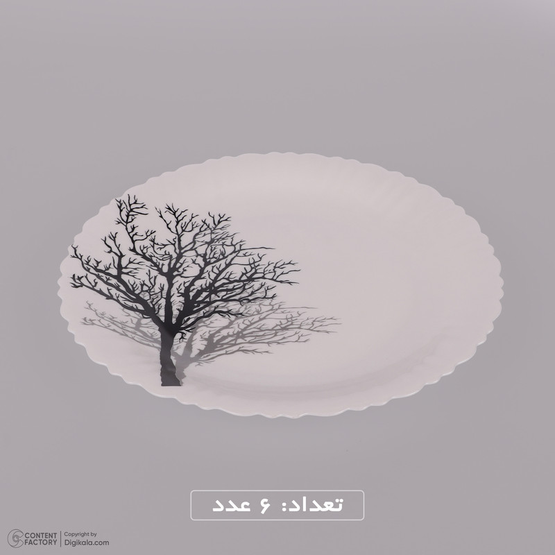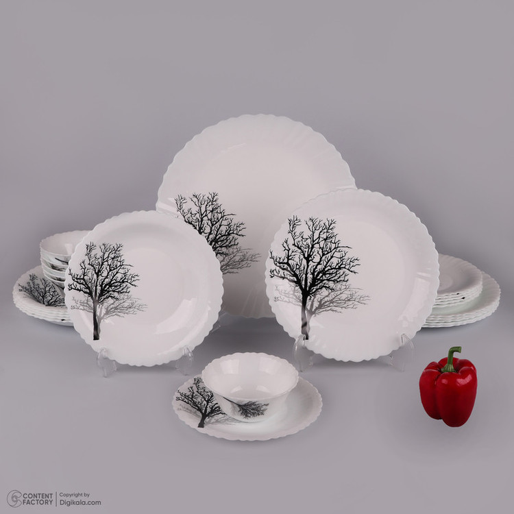 1 عدد دیس به ابعاد 33x33x2 سانتی متر - 6 عدد بشقاب غذاخوری به ابعاد 25x25x2 سانتی متر - 6 عدد بشقاب خورش خوری به ابعاد 22.5x22.5x3 سانتی متر - 6 عدد پیش دستی به ابعاد 19.5x19.5x1.5 سانتی متر - 6 عدد پیاله به ابعاد 12x12x5 سانتی متر