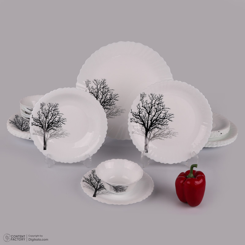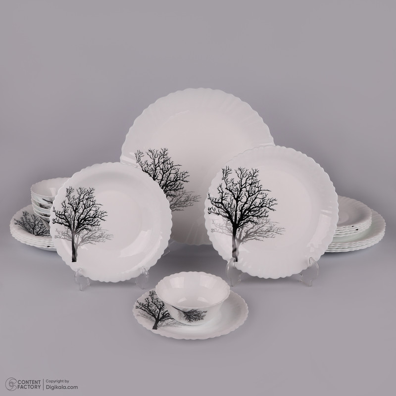 1 عدد دیس به ابعاد 33x33x2 سانتی متر - 6 عدد بشقاب غذاخوری به ابعاد 25x25x2 سانتی متر - 6 عدد بشقاب خورش خوری به ابعاد 22.5x22.5x3 سانتی متر - 6 عدد پیش دستی به ابعاد 19.5x19.5x1.5 سانتی متر - 6 عدد پیاله به ابعاد 12x12x5 سانتی متر