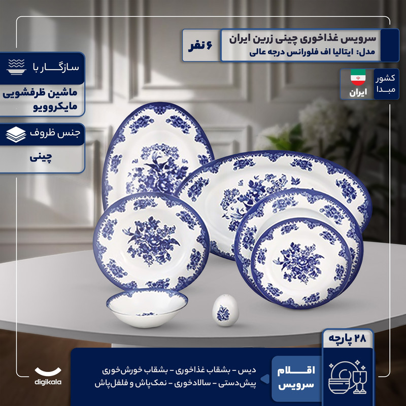 سرویس غذاخوری 28 پارچه 6 نفر چینی زرین ایران مدل ایتالیا اف فلورانس درجه عالی