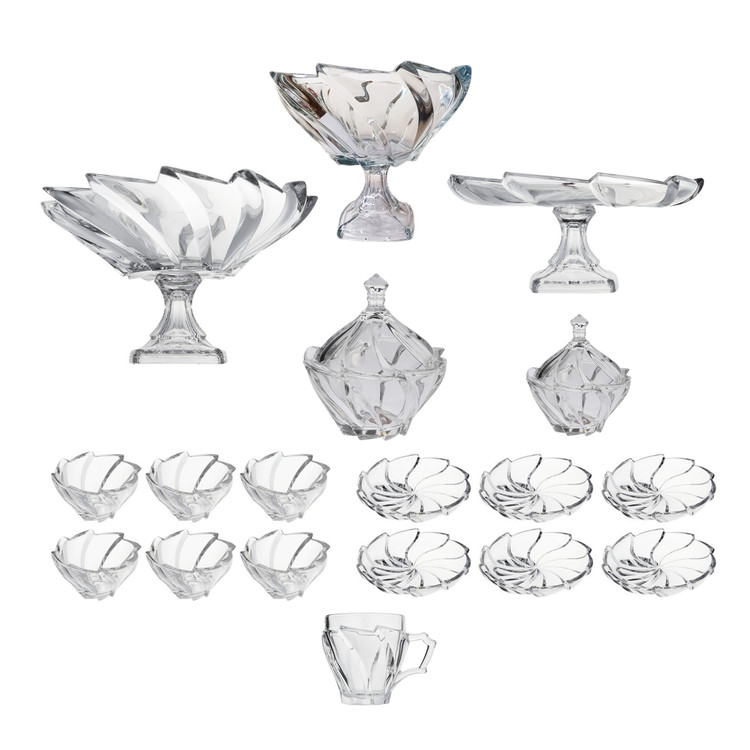 سرویس 25 پارچه ساکورا که شامل میوه خوری 1 پارچه ، آجیل خوری 1 پارچه، شیرینی خوری 1 پارچه ، شکلات خوری با درب 2 پارچه ، قندان با درب 2 پارچه ، استکان 6عدد ، پیاله کاسه کوچک 6 عدد ، پیش دستی 6 عدد می باشد.
