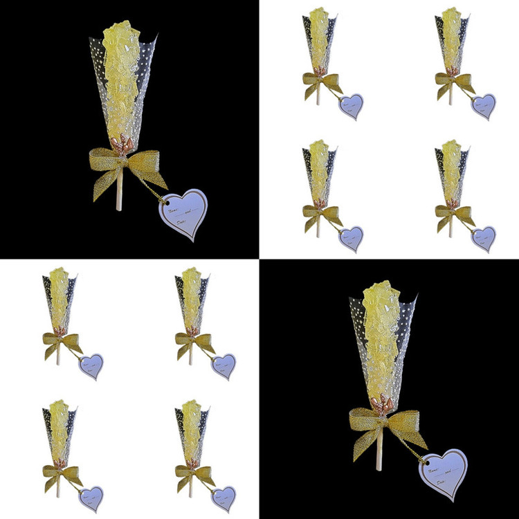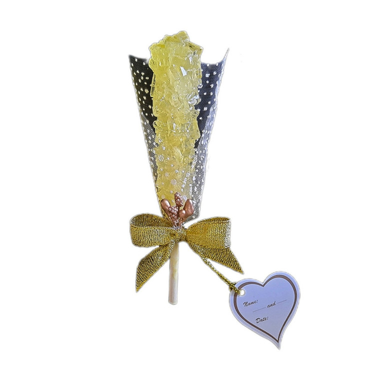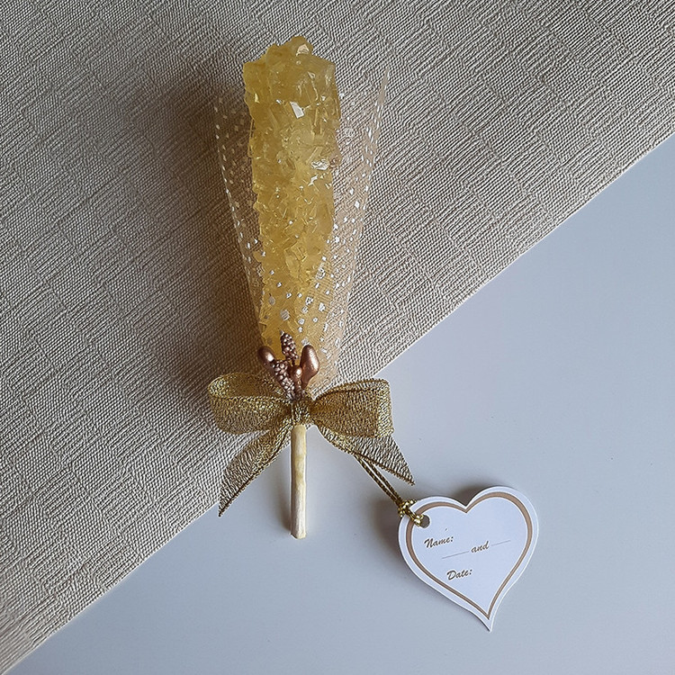 گیفت نبات زرد رنگ میباشد که با تور دونه برفی سفید ، روبان طلائی ، مروارید لپه ای سفید و پرچم طلائی تزئین شده است