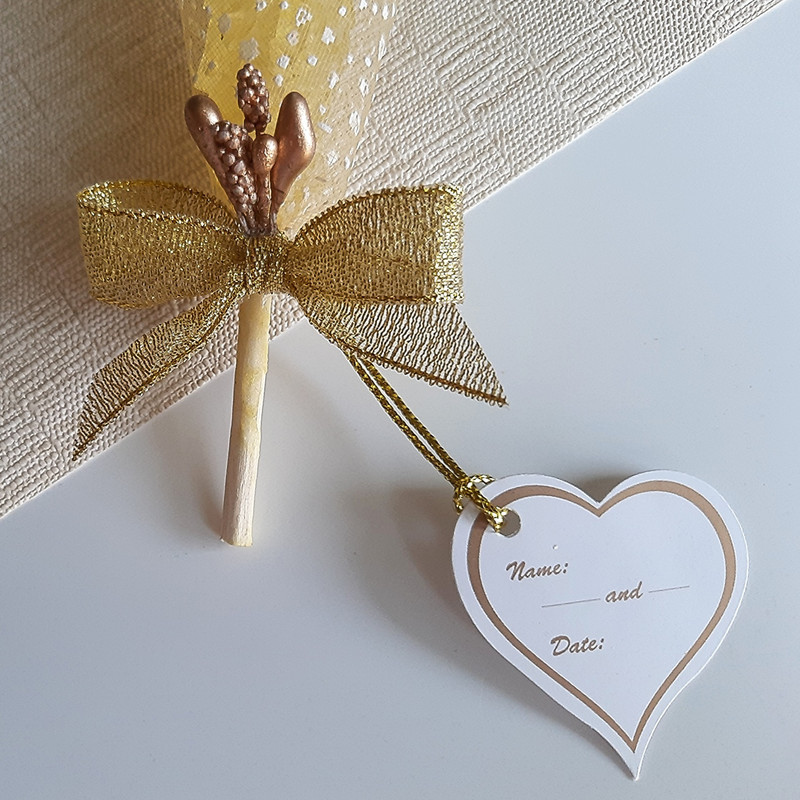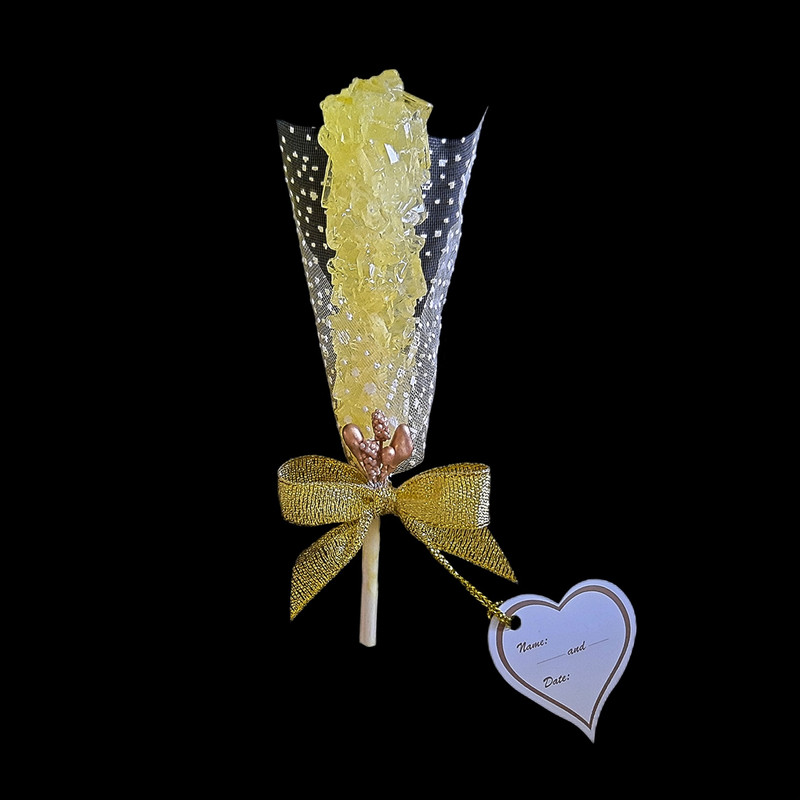 گیفت نبات زرد رنگ میباشد که با تور دونه برفی سفید ، روبان طلائی ، مروارید لپه ای سفید و پرچم طلائی تزئین شده است