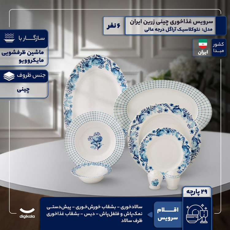 سرویس غذاخوری 29 پارچه 6 نفر چینی زرین ایران مدل نئوکلاسیک آراگل درجه عالی
