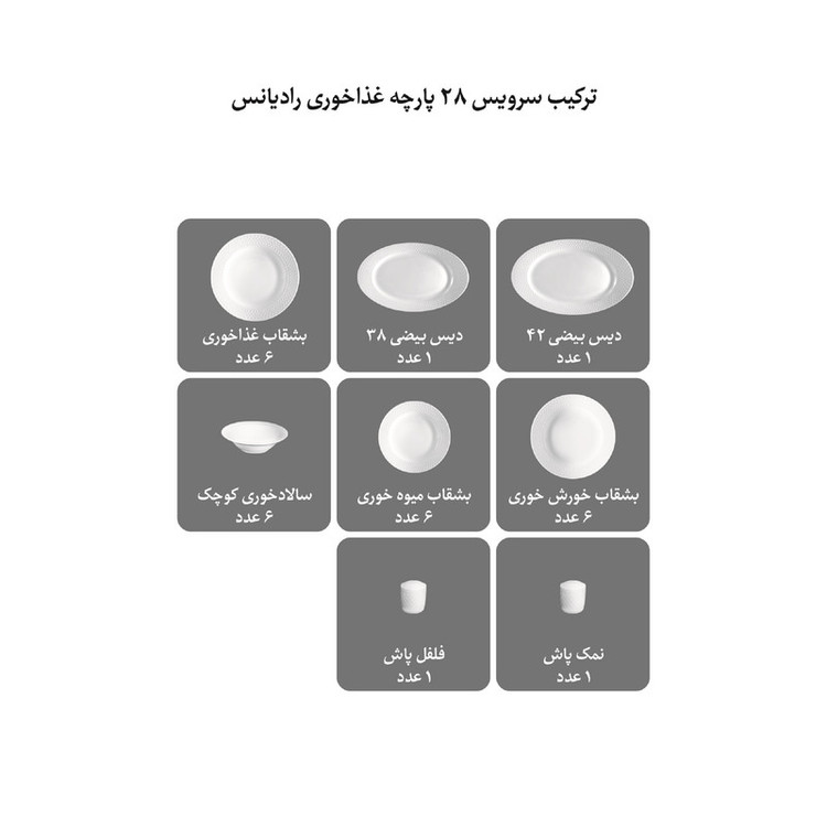 اقلام سرویس: سالادخوری , دیس , بشقاب غذاخوری , بشقاب خورشخوری , پیشدستی , نمکپاش و فلفلپاش