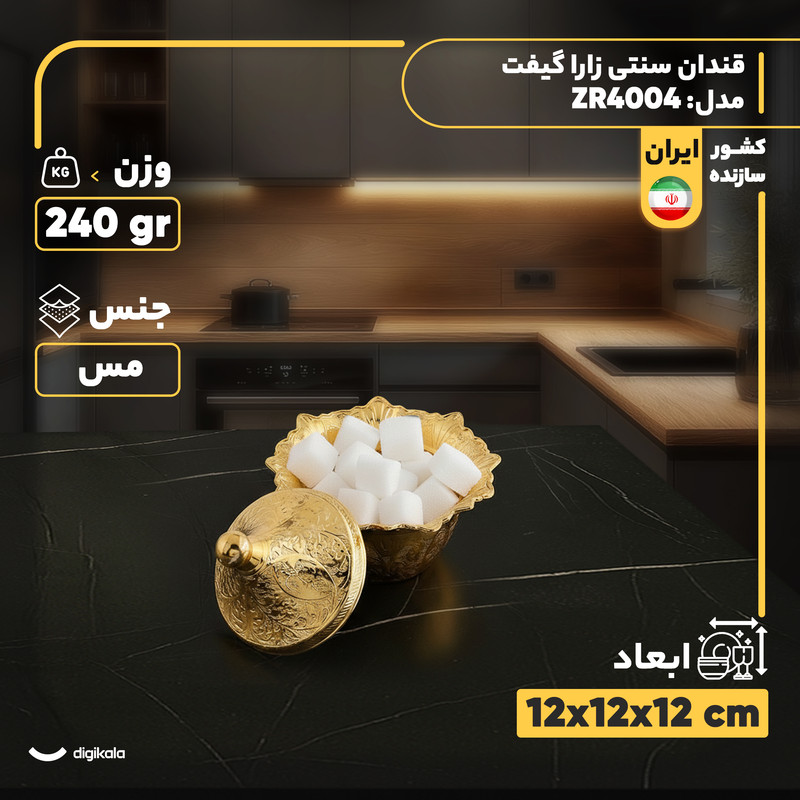 قندان سنتی مدل ZR4004 جلوهای زیبا از هنر اصیل ایرانی است که با طراحی چشمنواز و ساختی باکیفیت، میتواند زینتبخش میز پذیرایی شما باشد. این محصول در استان و شهر تهران تولید شده و از جنس مس ساخته شده است که علاوه بر درخشش خاص، دوام و ماندگاری بالایی دارد. ابعاد ۱۲×۱۲×۱۲ سانتیمتری و وزن ۲۴۰ گرمی آن باعث میشود قنددان به اندازهای مناسب برای استفاده روزمره یا پذیرایی از مهمانان باشد. سطح براق و پرداخت شدهی مسی، جلوهای لوکس و سنتی به فضا میبخشد و میتواند بهعنوان یک عنصر تزئینی نیز مورد استفاده قرار گیرد. قندان سنتی مدل ZR4004 نمونهای از تلفیق هنر و کاربرد است؛ محصولی که حس اصالت و گرمای فرهنگ ایرانی را به خانه شما میآورد. این قندان انتخابی ایدهآل برای علاقهمندان به صنایعدستی و ظروف سنتی ایرانی است.