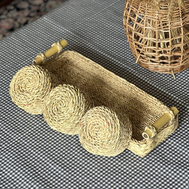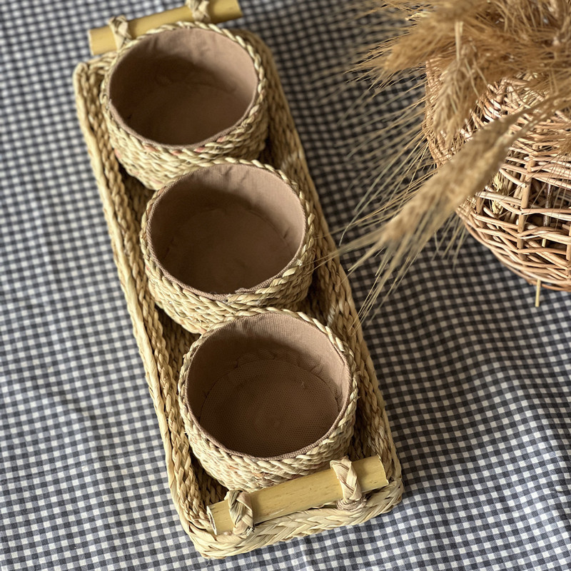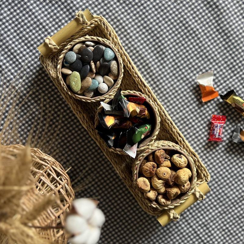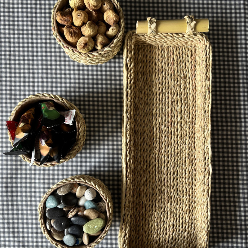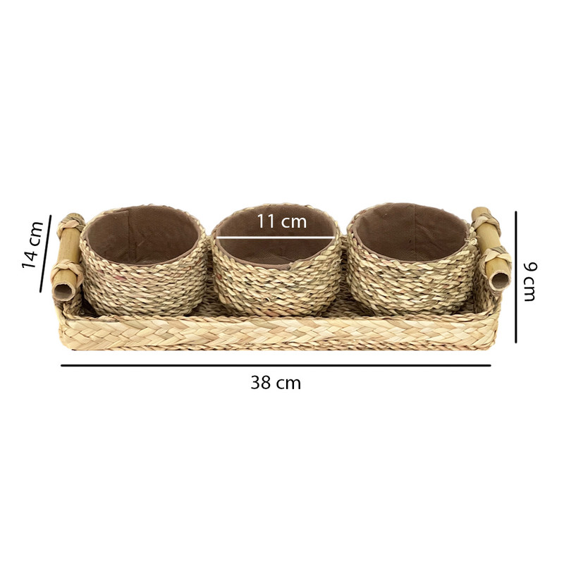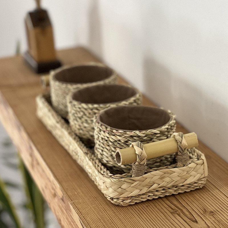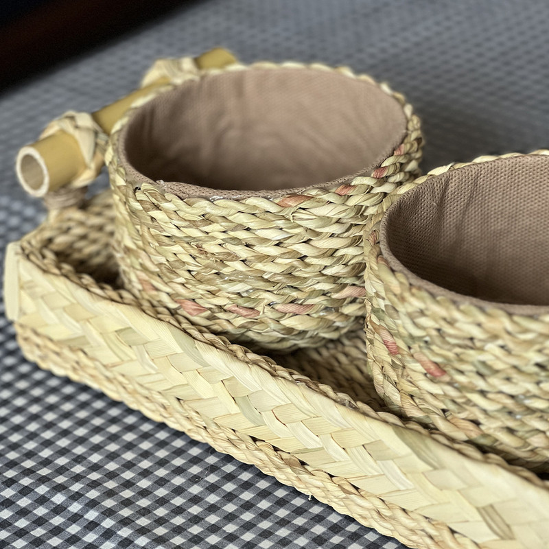 اردوخوری حصیری مدل چهار تکه طرح دسته بامبو کاملا دست ساز و انحصاری بوده و با عشق تولید شده است. کف این محصول چوب میباشد و روی آن ریسه های حصیری به کار رفته است، به همین دلیل این سینی بسیار محکم بوده و کاملا کاربردی است. دسته محصول نیز چوب بامبو است که زیبایی آن را دوچندان کرده است. این محصول دارای سه پیاله زیباست که جداشونده هستند و میتوانید از آنها به صورت جداگانه هم استفاده کنید. از این محصول میتوانید به عنوان سینی سرو و پذیرایی، سبد دکوراتیو، سینی آجیل و تنقلات، ظرف شیرینی و مزه، سینی میوه و بسیاری موارد دیگر استفاده کنید. در صورت کثیف شدن میتوانید با پارچه نمدار آن را تمیز کرده و خشک کنید. این محصول بسیار سبک و محکم میباشد و گزینه مناسبی برای دیزاین منزل شماست.