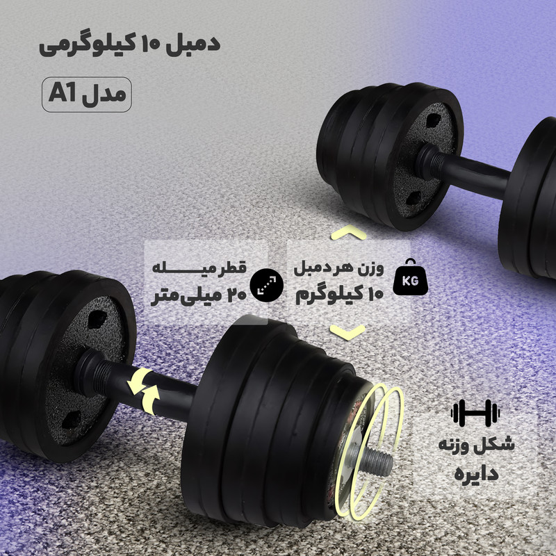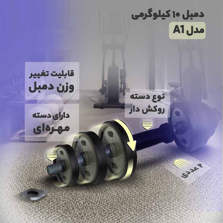 دارای دسته دمبل مهره ای و قابلیت تغییر وزن دمبل وزنه ها با رنگ کوره ای استاتیک و روکش لاستیکی