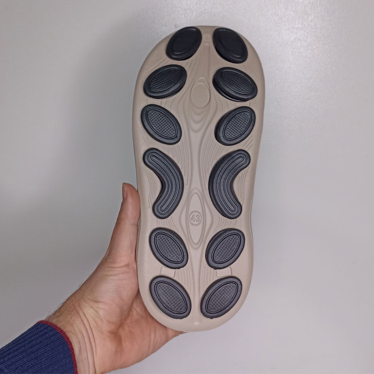 -کف ایرگونومیک و دارای برجستگی جهت راحتی و طبی بودن -مناسب محیط های داخلی و بیرونی -ضد لیز -قالب نسبتا بزرگ -وزن یک لنگه حدود 230 گرم -ضخامت در قسمت پاشنه حدود 3.5 الی 4 سانت -رویه طرح چاپی