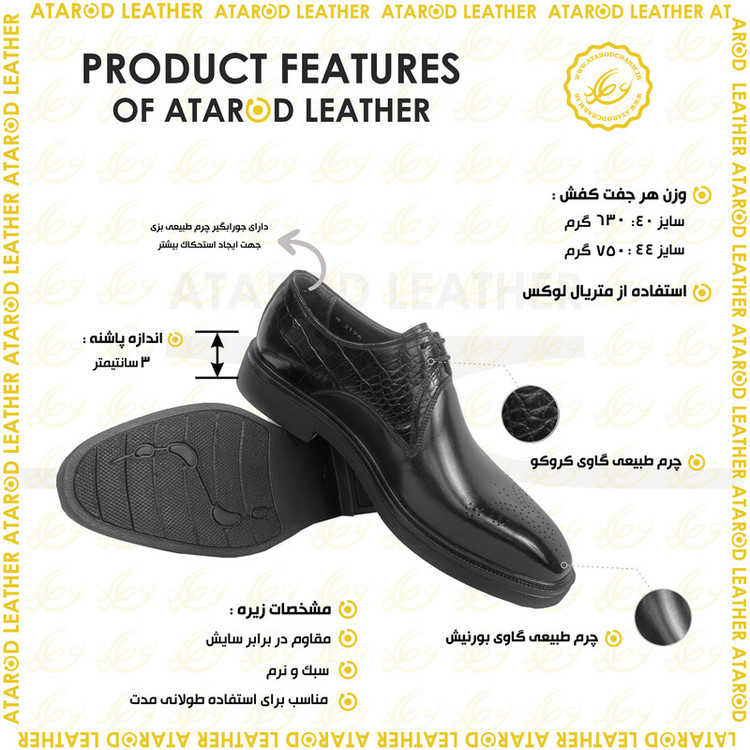رویه کفش ترکیب چرم طبیعی لوکس گاوی روستیک و کروکو برند ثبت شده عطارد آستر داخل کفش چرم طبیعی بزی لوکس کفی تمام چرم طبیعی بزی لوکس از سری کفش های ژورنالی برند چرم عطارد دارای بسته بندی اختصاصی مناسب برای هدیه