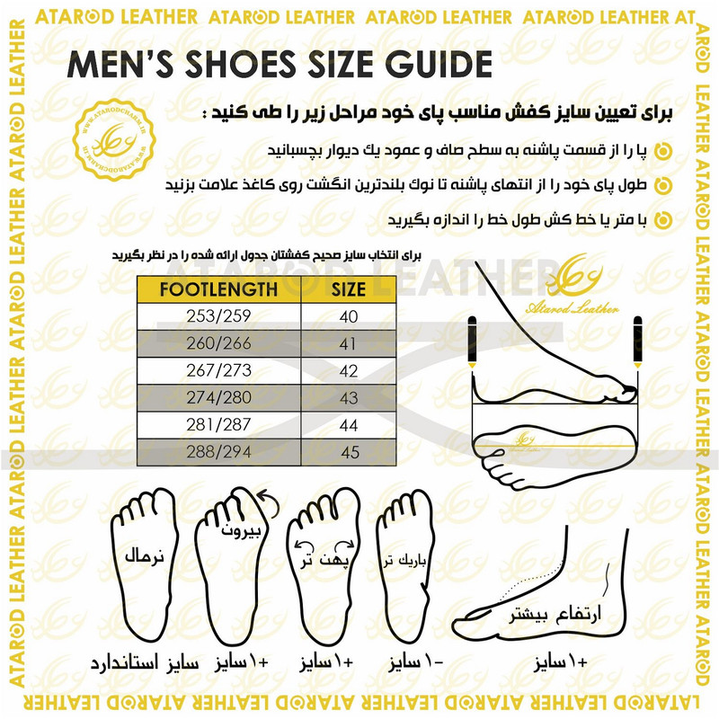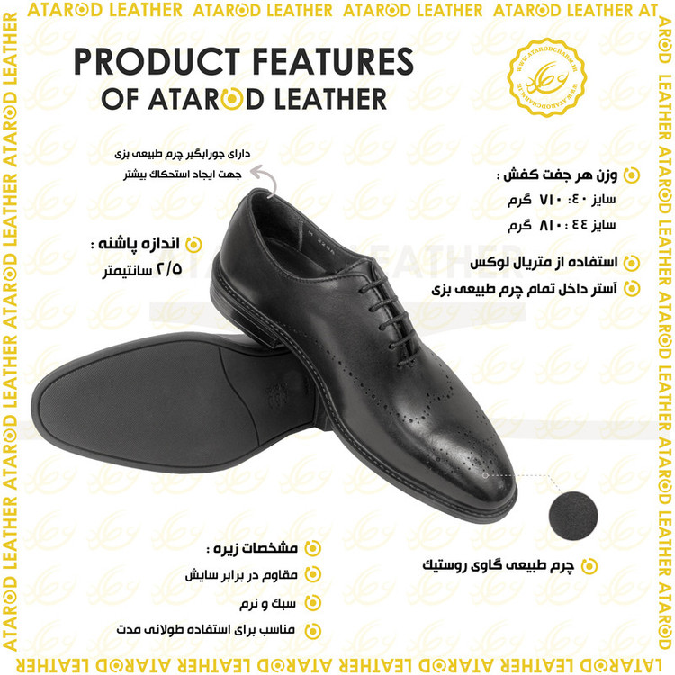 رویه کفش چرم طبیعی لوکس گاوی روستیک برند ثبت شده عطارد آستر داخل کفش چرم طبیعی بزی لوکس کفی تمام چرم طبیعی بزی لوکس از سری کفش های ژورنالی برند چرم عطارد دارای بسته بندی اختصاصی مناسب برای هدیه