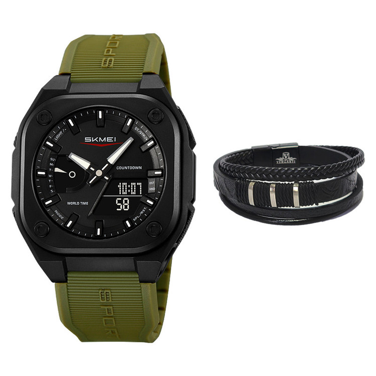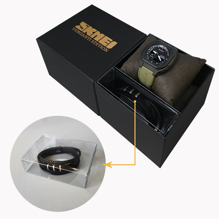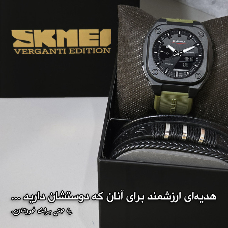 سایر توضیحات : این مجموعه شامل ساعت مدل 2328 اسکمی با بند TPU، قابلیتهایی مثل زمان جهانی، کرونومتر، زنگ هشدار، تقویم و نور EL، و دستبند چرمی ورگانتی با طراحی چندلایه و نوارهای فلزی است که استایل و راحتی را به شما هدیه میدهد.