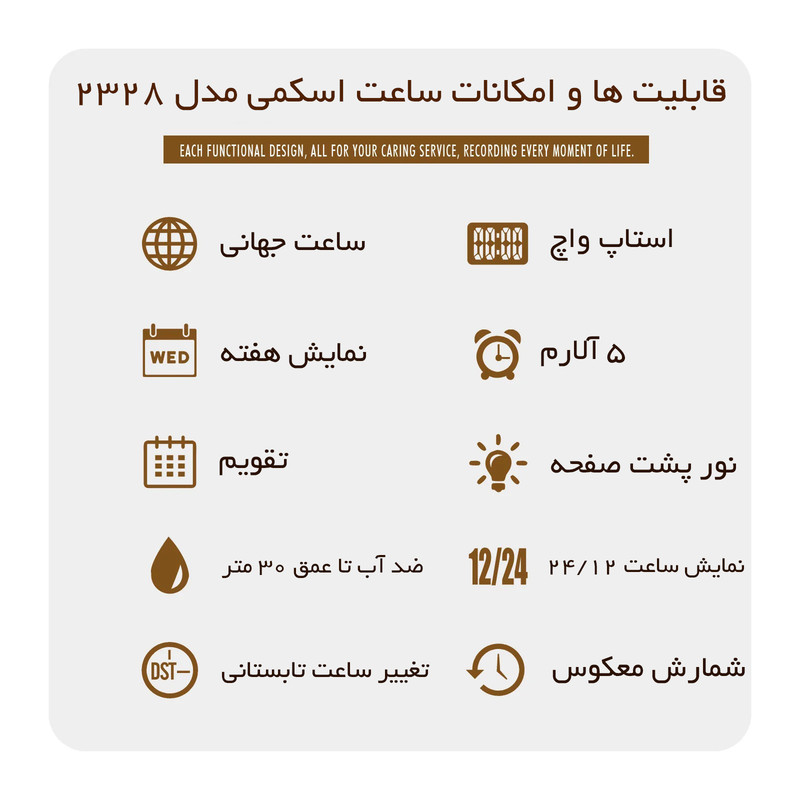 قابلیتهای تخصصی ساعت : نمایش 24 ساعته , تایمر , نور پسزمینه , نمایش ساعت دوم , تاریخشمار , آلارم , ضدآب