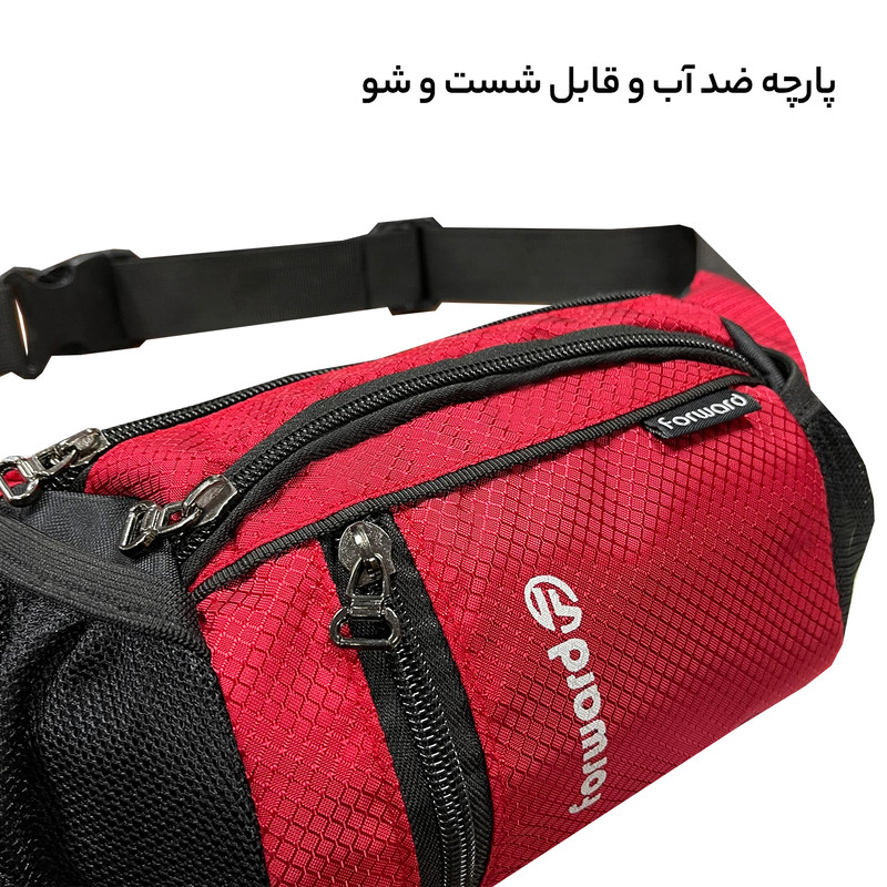 دارای ابر و آستر در سرتاسر کیف کمری دارای بند بسیار ضخیم قفل دار قابل تنظیم دارای پارچه ضد آب و قابل شست و شو