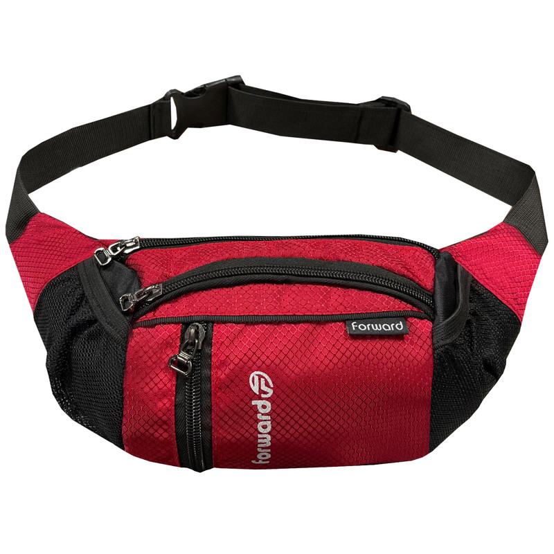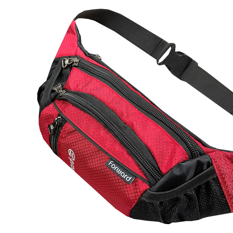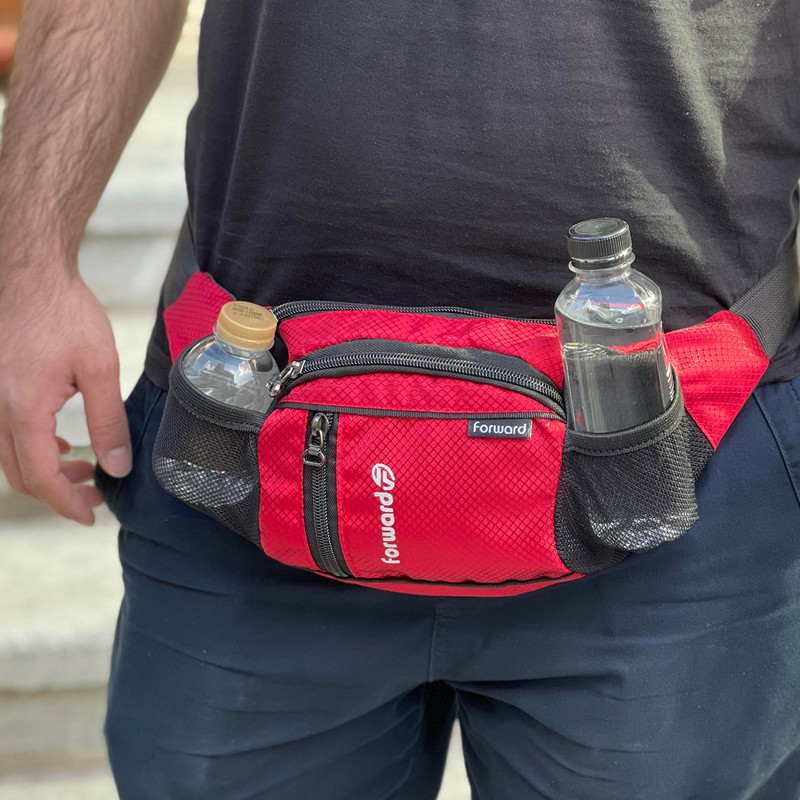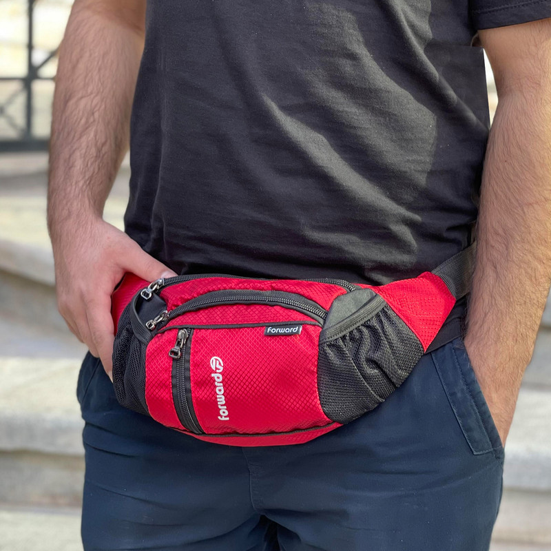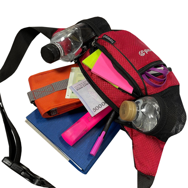 دارای یک زیپ مخفی در قسمت پشتی کیف کمری دارای 3 زیپ بزرگ در قسمت جلویی کیف کمری دارای دو جیب توری کش دار جهت قرار دادن وسایل و بطری نوشیدنی