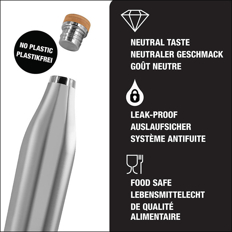 رنگ بندی: سفید، آبی و لیمویی جنس: فولاد ضد زنگ 18/8 و بامبو طبیعی ارتفاع: 28٫7 سانتی متر قطر: 7٫9 سانتی متر وزن: 353 گرم فاقد BPA کاملا ضدنشت بسیار سبک طراحی سوئیس