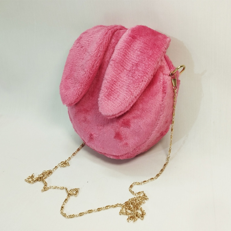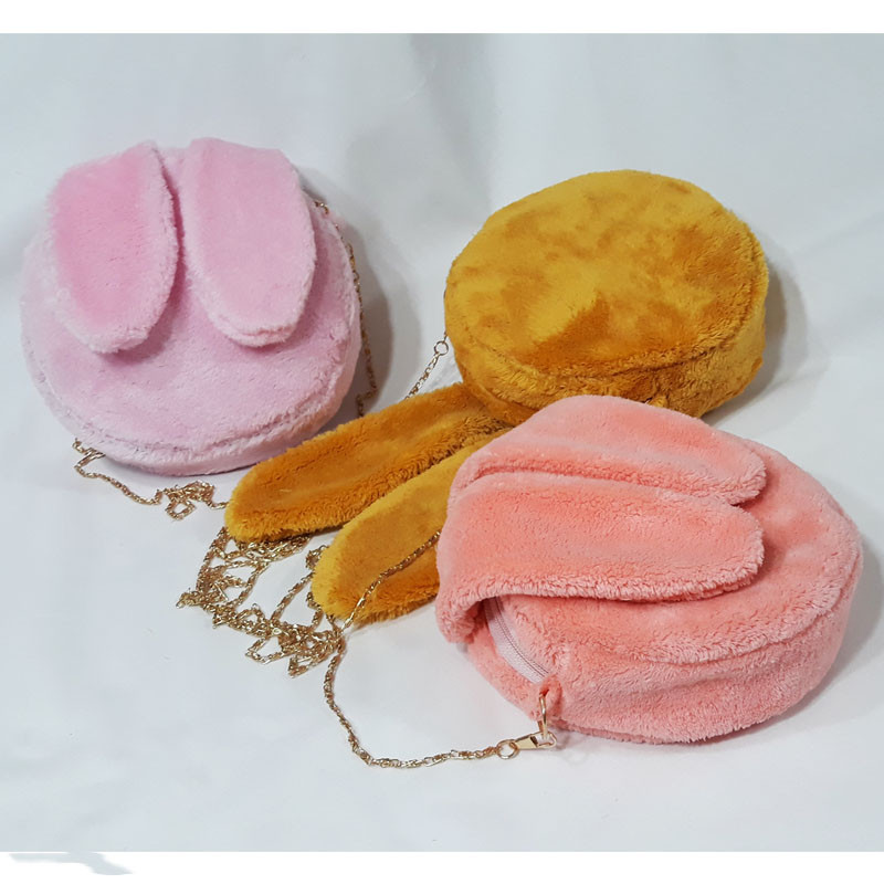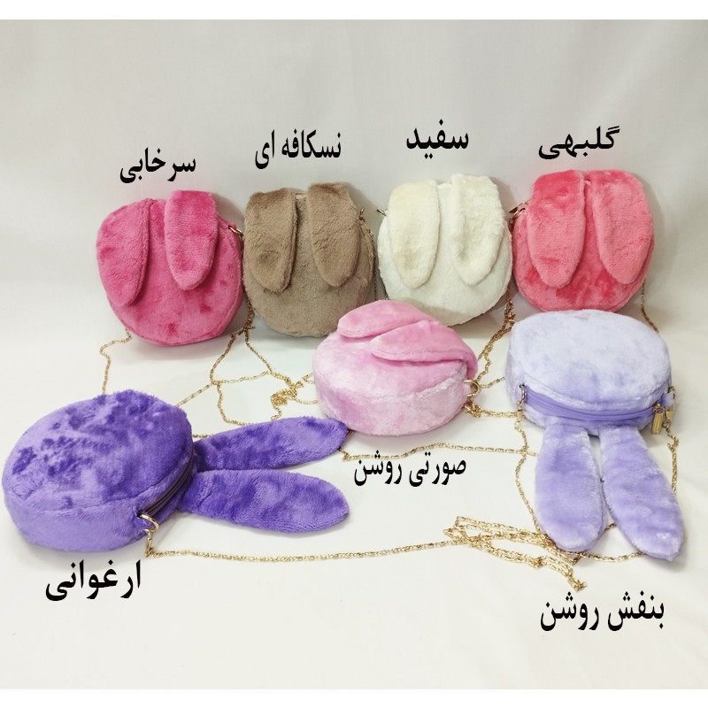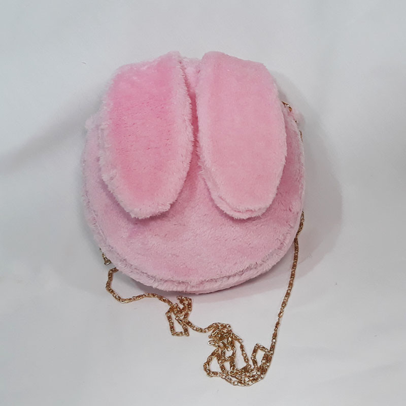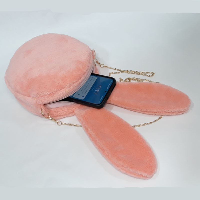 کیف دوشی دخترانه طرح خرگوش به شکل دایره با قطر 19 سانتیمتر و ضخامت 6 سانتیمتری مناسب برای جایگیری گوشی موبایل - از جنس پارچه نیوسافت با خزهای کوتاه