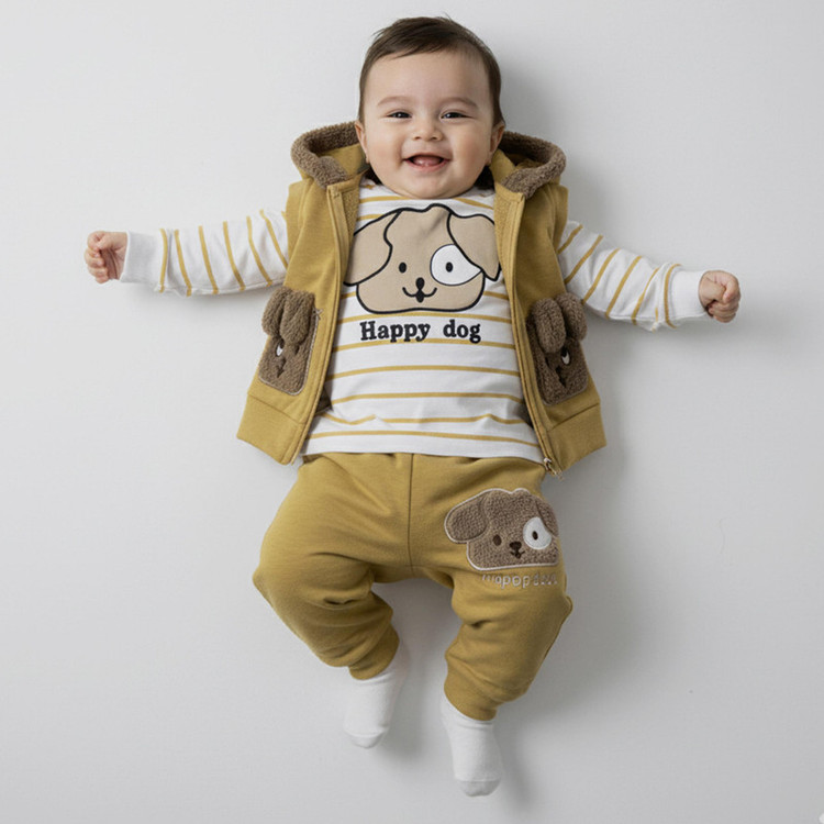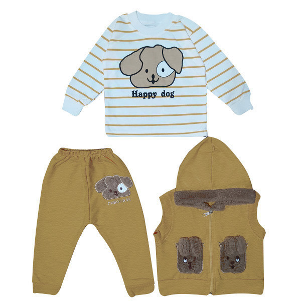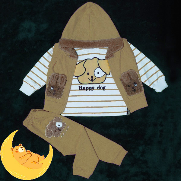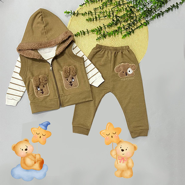 ست سه تکه لباس جلیقه کلاه دار، تیشرت آستین بلند و شلوار دارای کلاه خز دار دارای زیپ مناسب پاییز، بهار و زمستان حلقه آستین و پایین جلیقه کشبافت دارای تکه دوزی دارای کاور و چوب لباسی مناسب هدیه و سیسمونی مناسب دختر و پسر