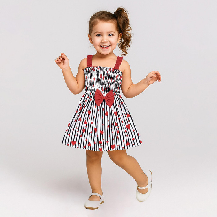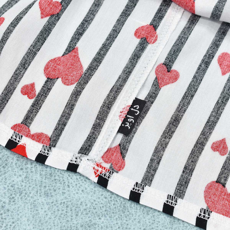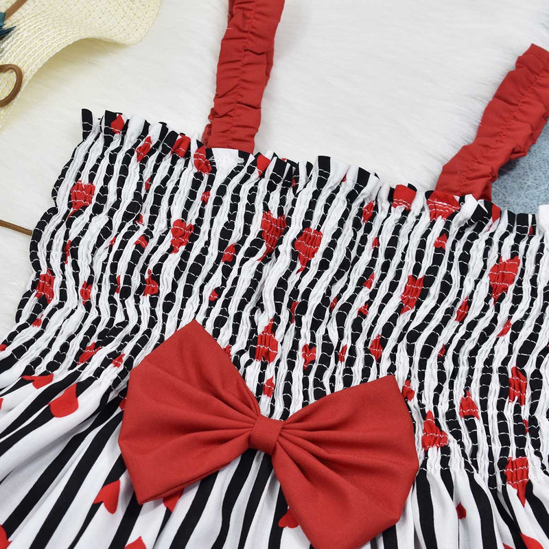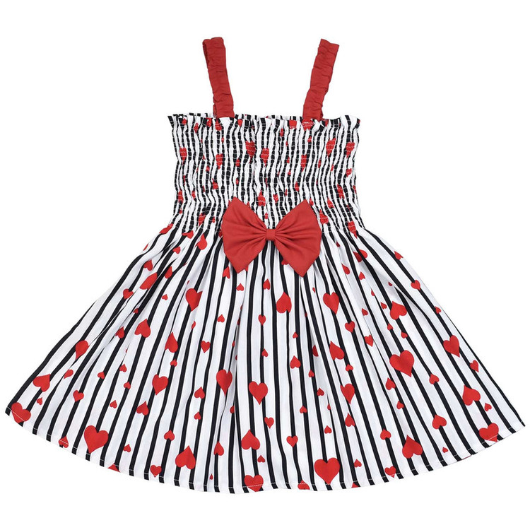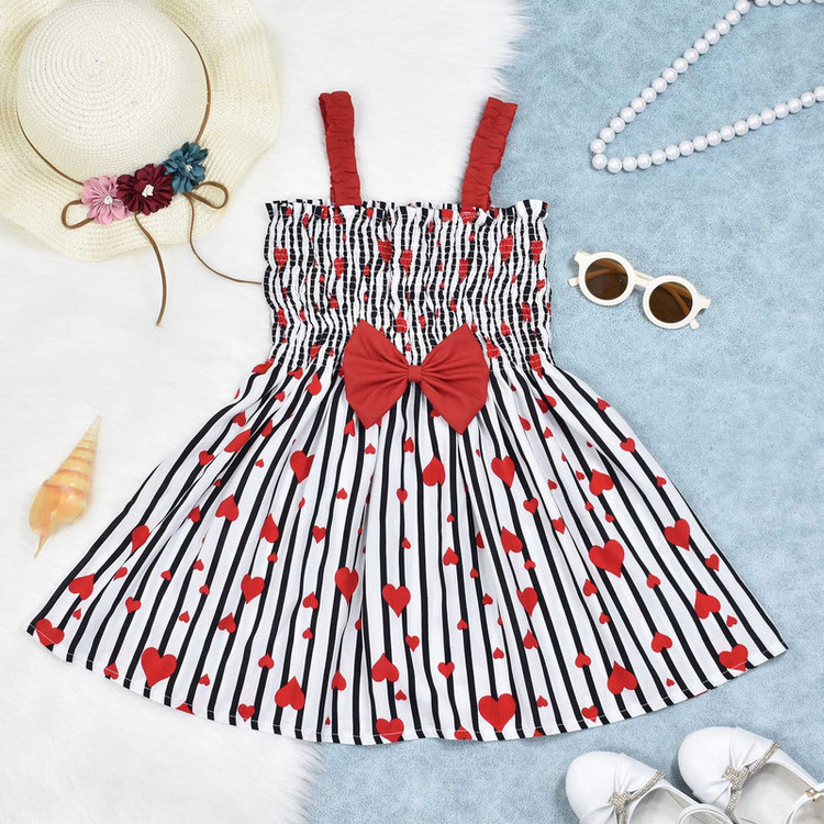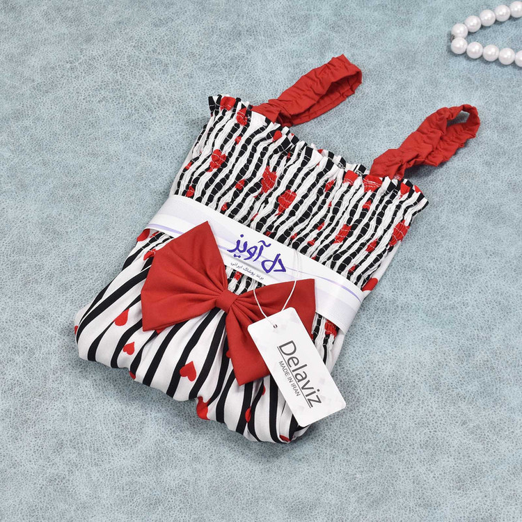 پیراهن دخترانه مدل کشدوزی عریض دارای قابلیت کشسانی بالا و راحتی بیشتر با جنس تمام نخی(بدون هیچ درصدی از مواد پلی استر) طرح زمینه راه راه با قلبهای قرمز و پاپیون