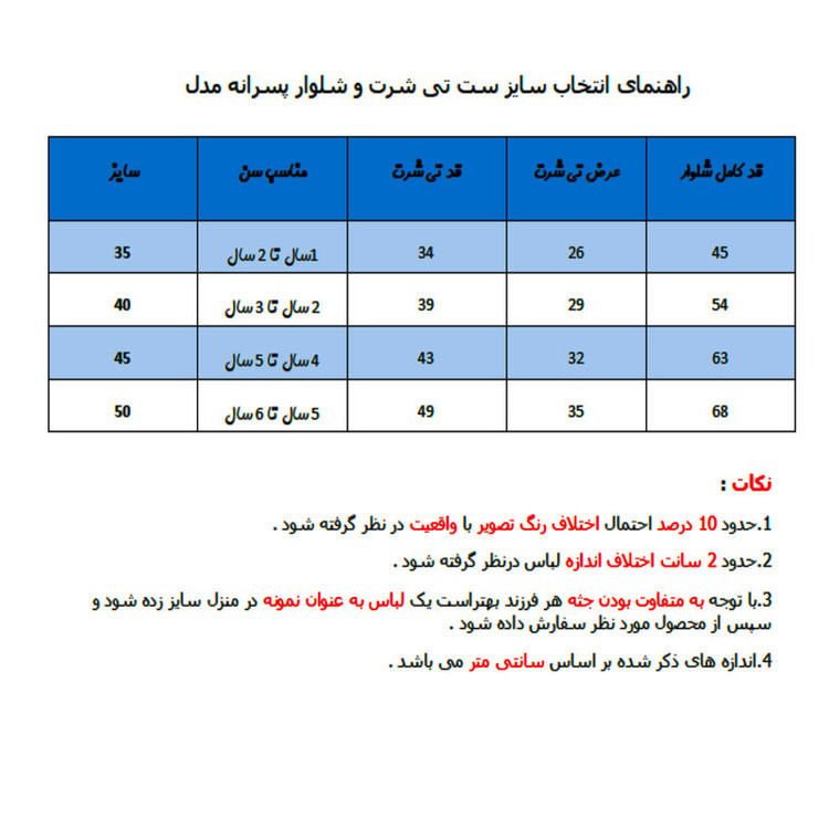 سایز 1 تا 2 سال = 35 سانت سایز 2 تا 3 سال = 40 سانت سایز 4 تا 5 سال = 45 سانت سایز 5 تا 6 سال = 50 سانت