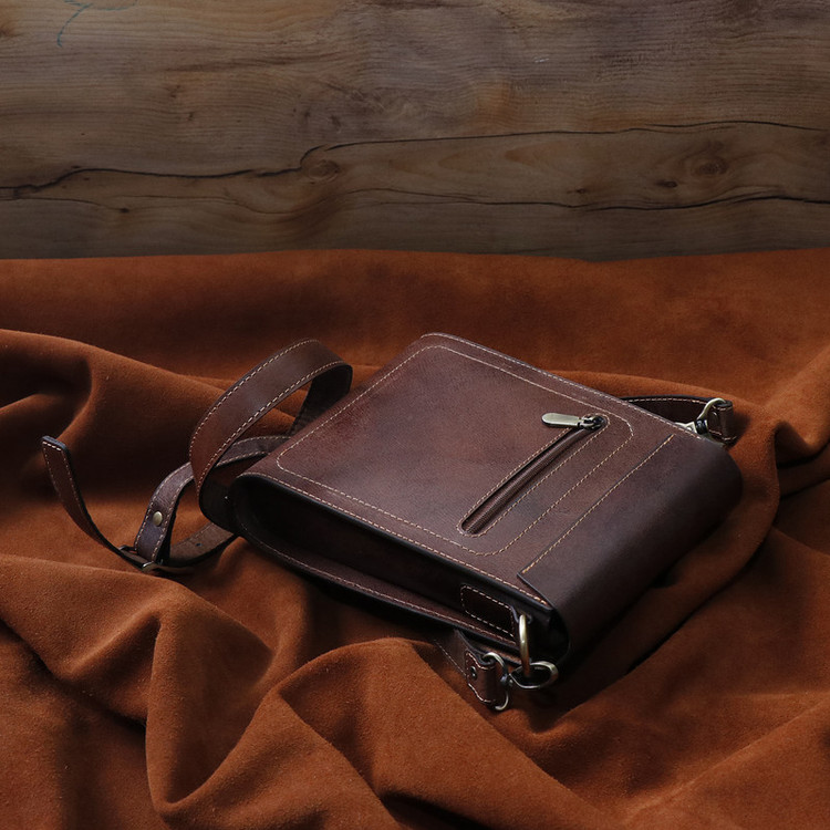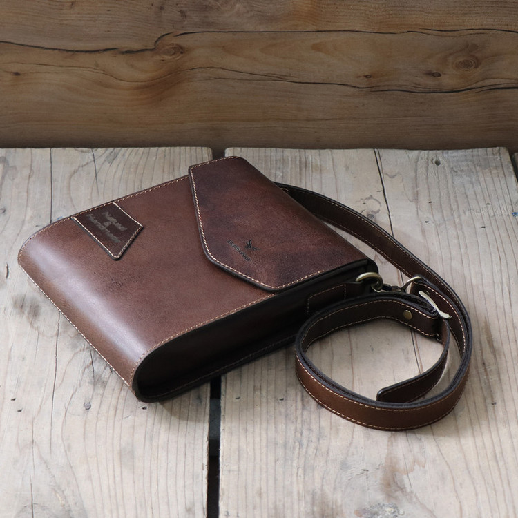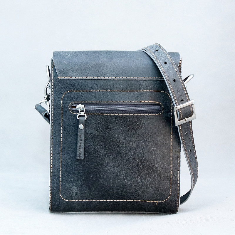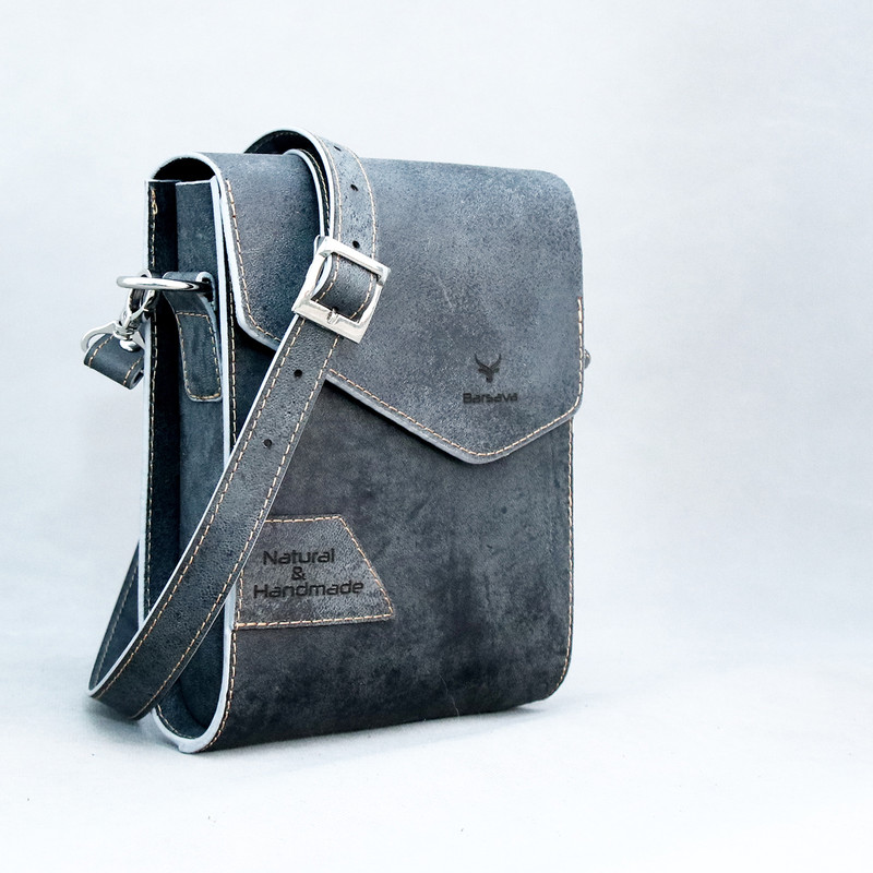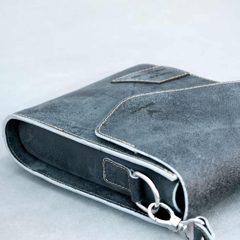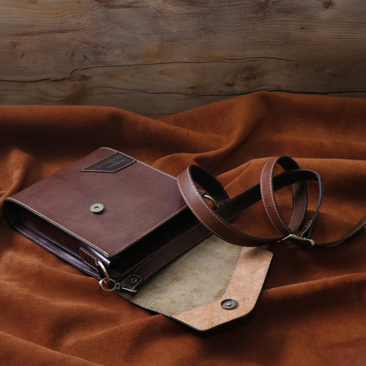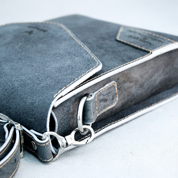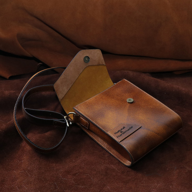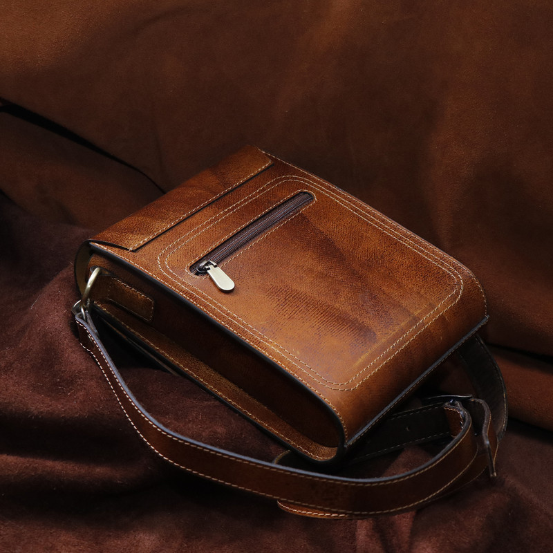 چرم استفاده شده در این کار چرم طبیعی شتری است که نسبت به چرم گاوی ضیخیم تر است و استحکام بیشتری دارد، پرداخت کمتری روی آن شده و ظاهر یکنواخت یا یکدستی ندارد ،از سوی دیگر این نوع چرم خشک تر است و انعطاف کمتری دارد اما به مرور زمان صیقلی تر و نرم تر می شود