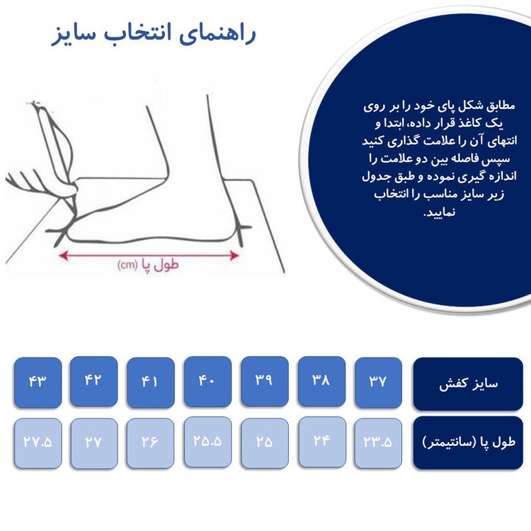 جزئیات: رنگ سرمه ای، سبک، دوخت ظریف، کفی نرم و زیره مقاوم در برابر سایش. جهت انتخاب سایز مناسب، جدول سایز را بررسی فرمایید.