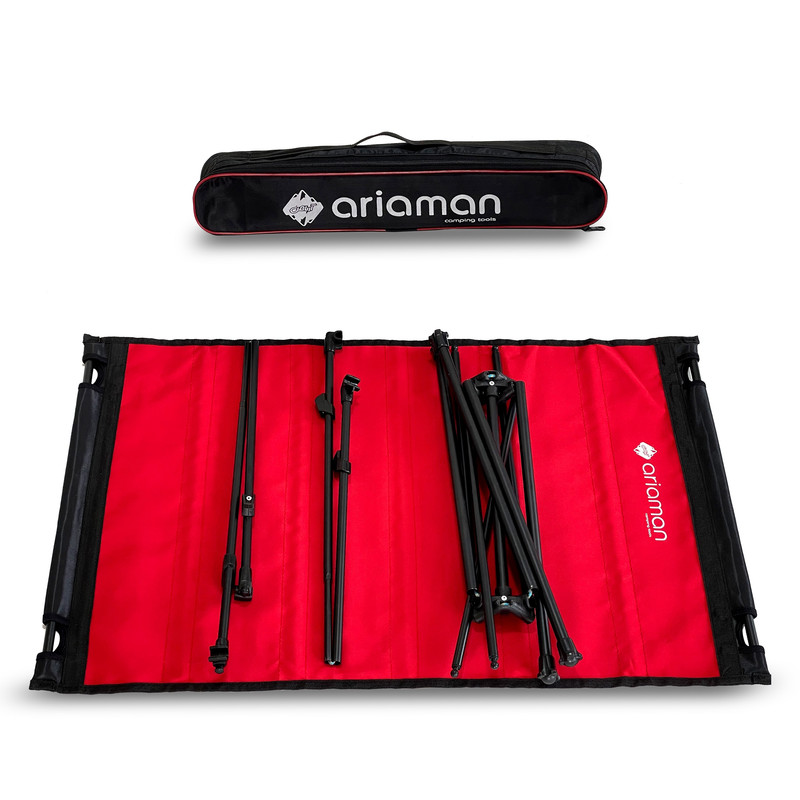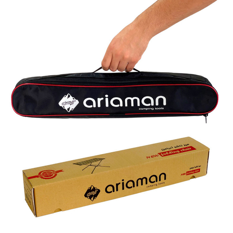 میز تاشو آریامن ارتفاع 53 سانتی متر ابعاد پارچه رویه 76×49 سانتیمتر پارچه دو رو (یک رو مشکی و یک رو رنگ انتخابی) کیف زیپ دار به ابعاد 53×9 سانتی متر